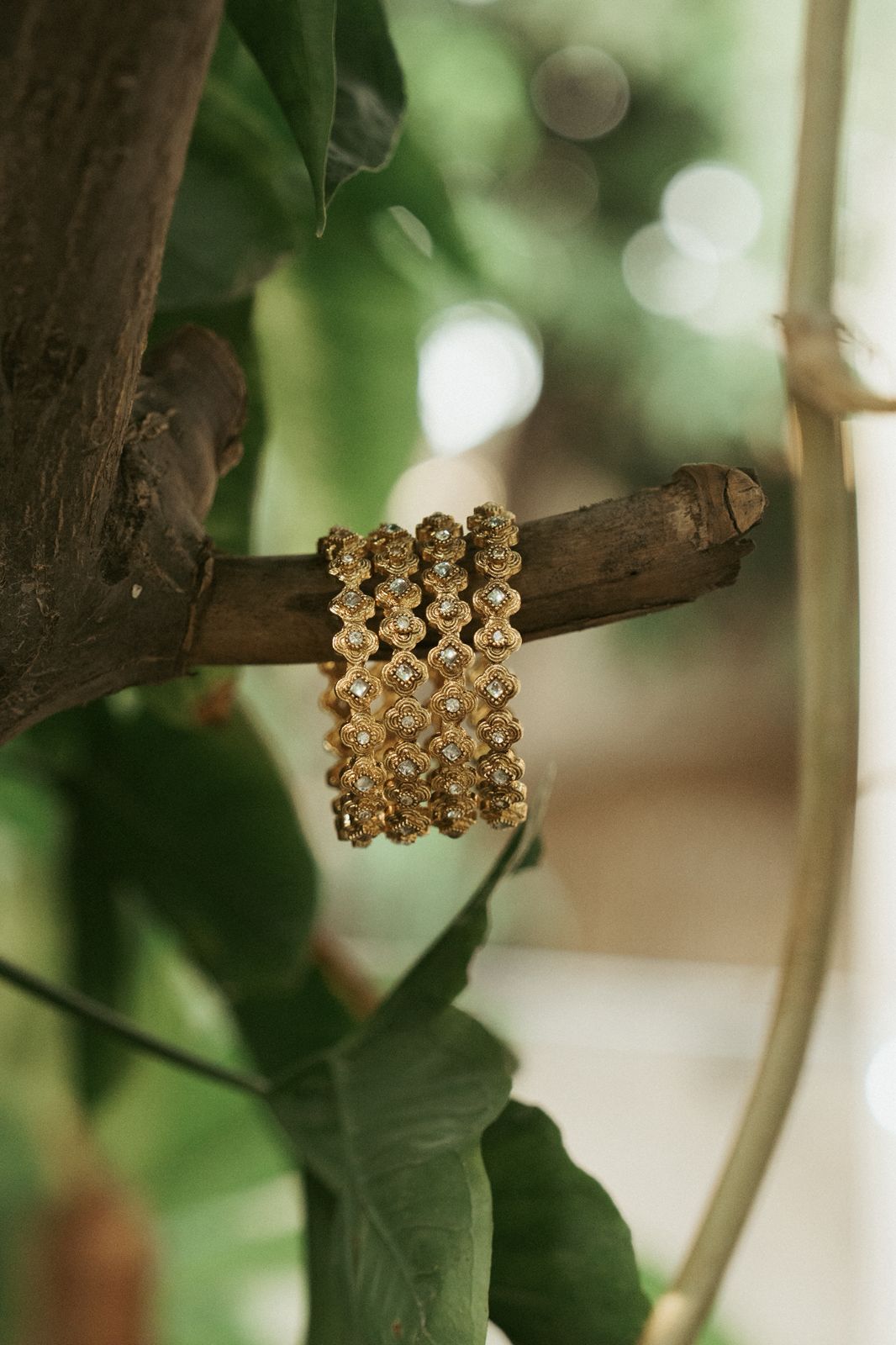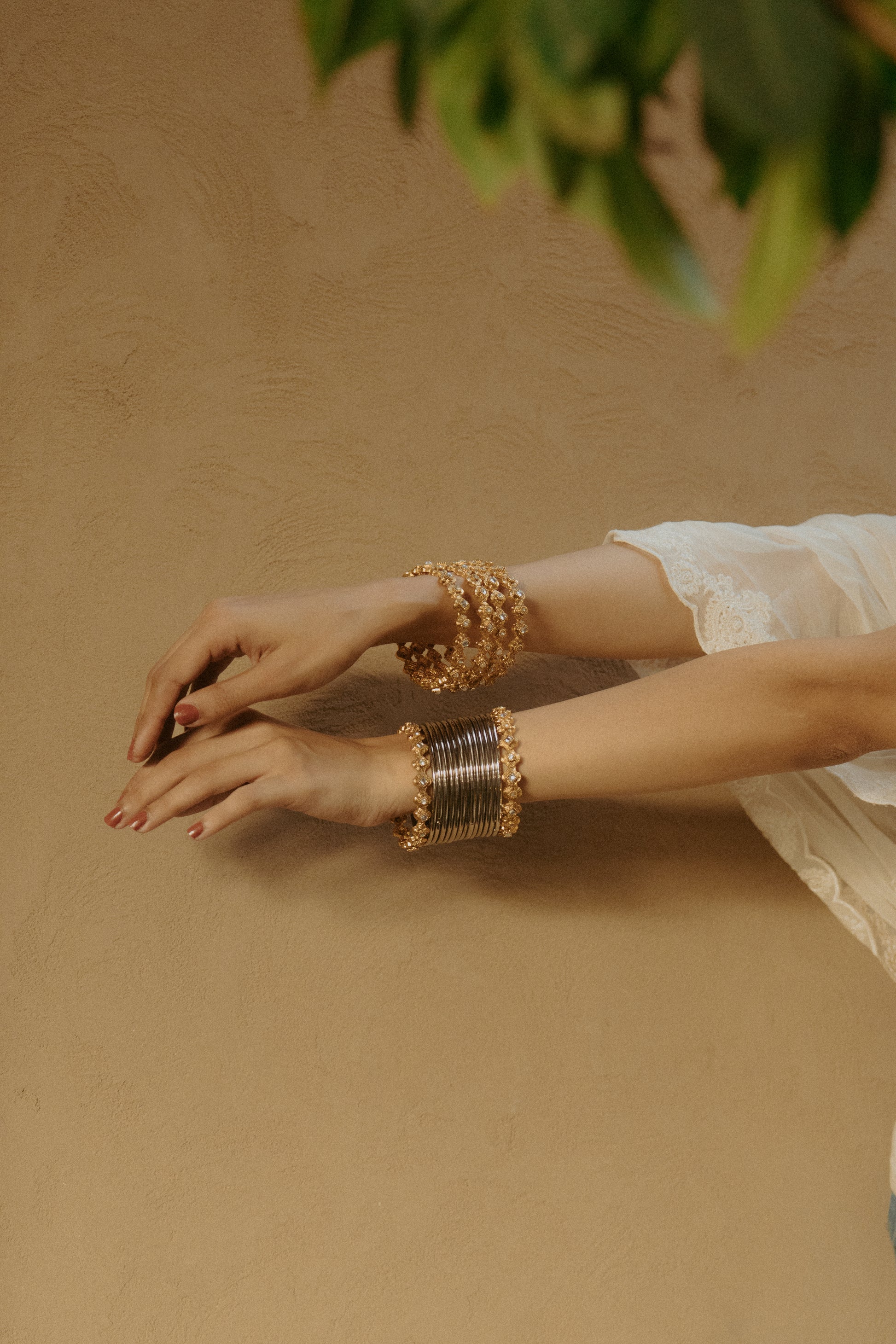 Set of four karra's featuring two gold-toned floral link designs and two stacks of sleek metallic bangles with gold-beaded edges, blending tradition with modern elegance.