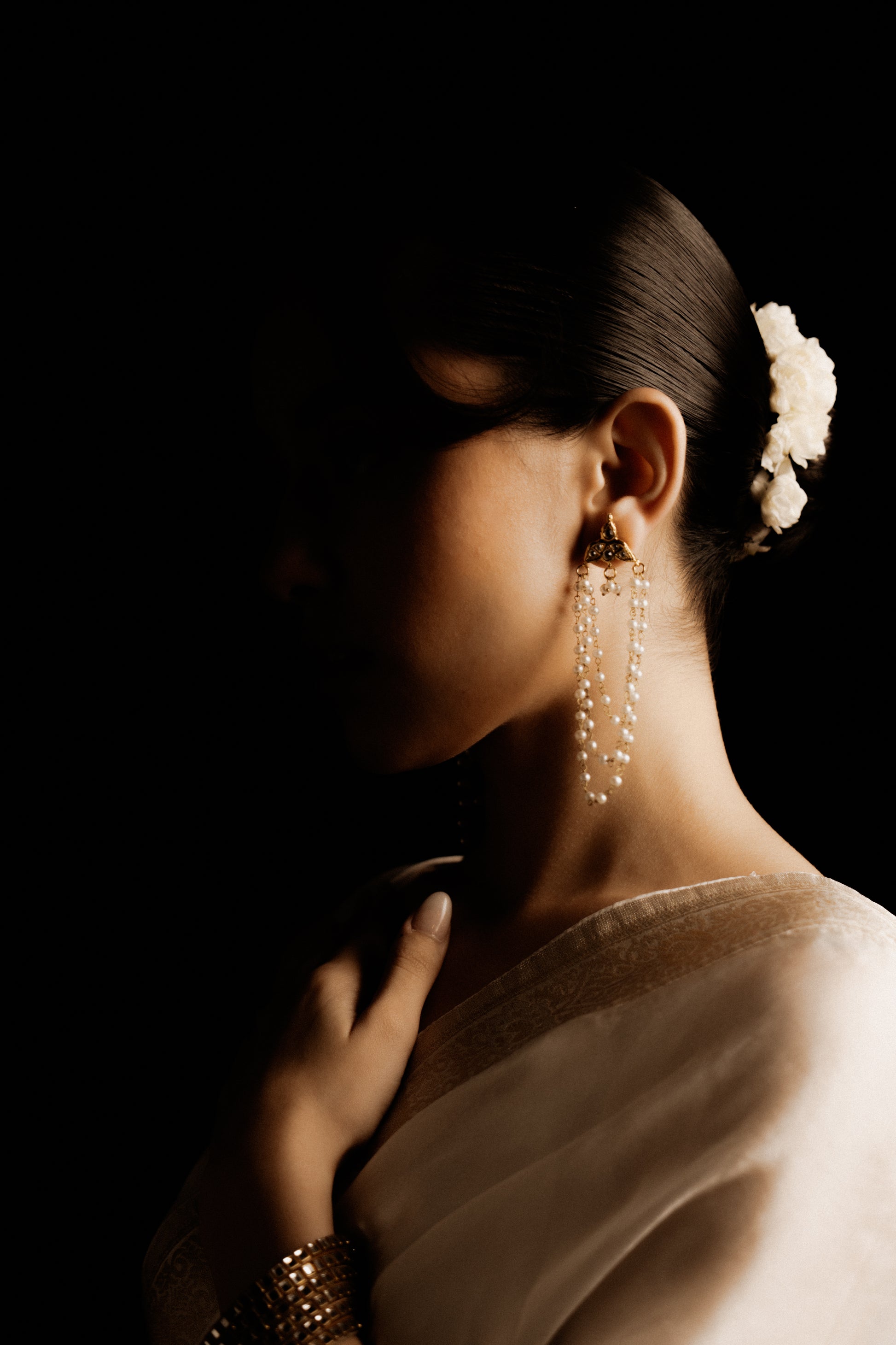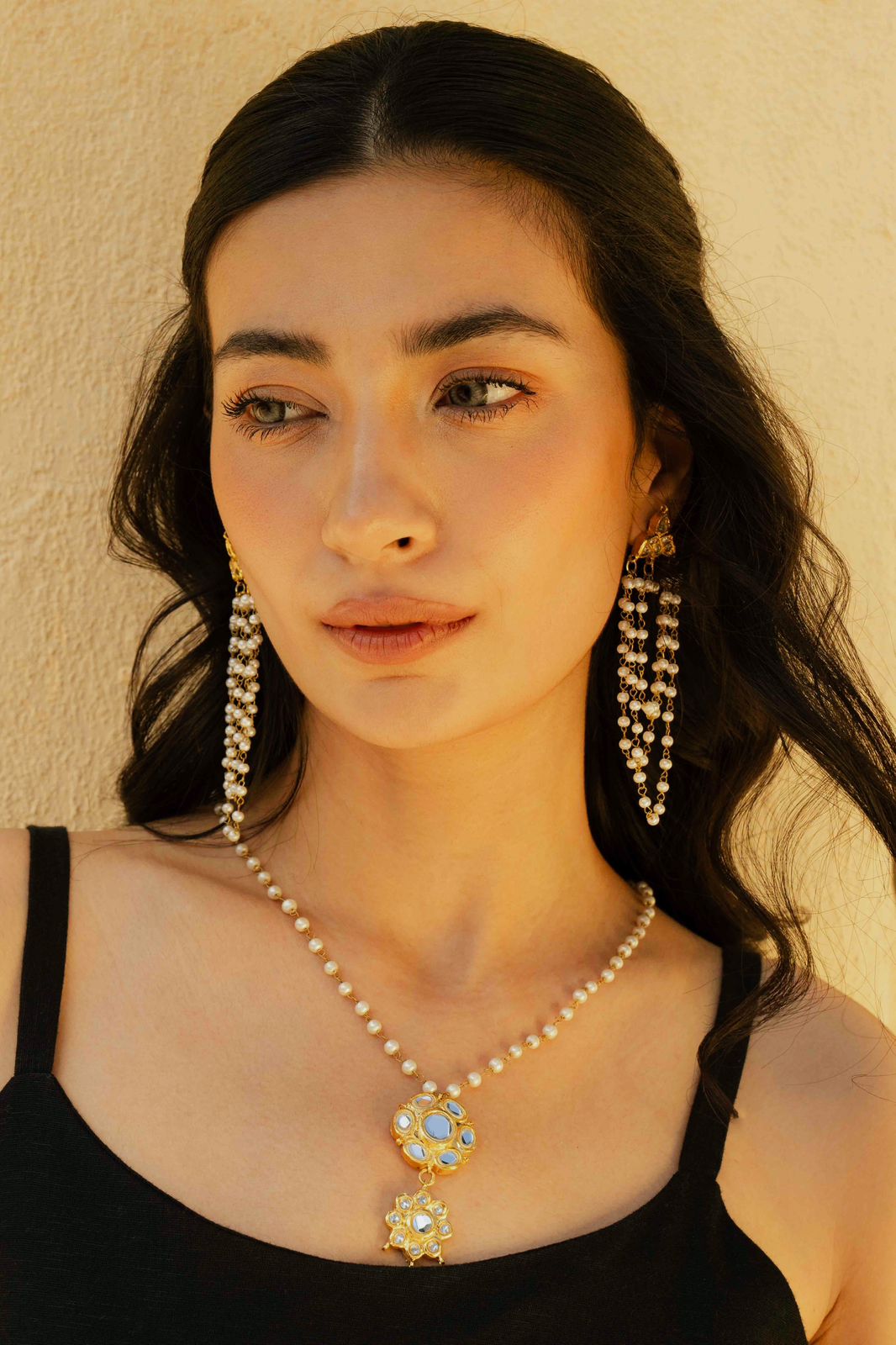 The earrings are gold-plated, featuring cultured pearls and intricate Kundan work. A timeless design perfect for adding a touch of elegance to any outfit.