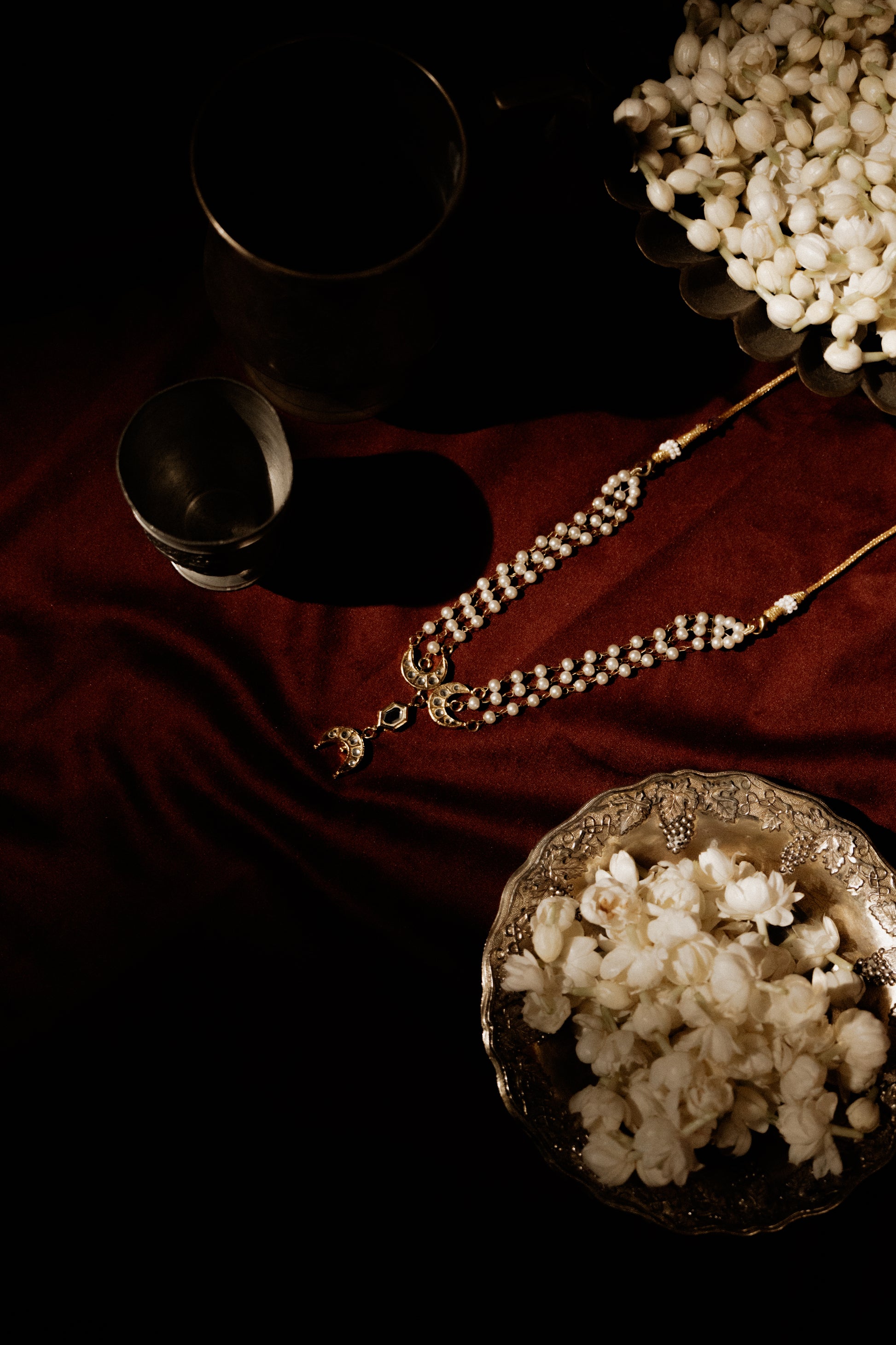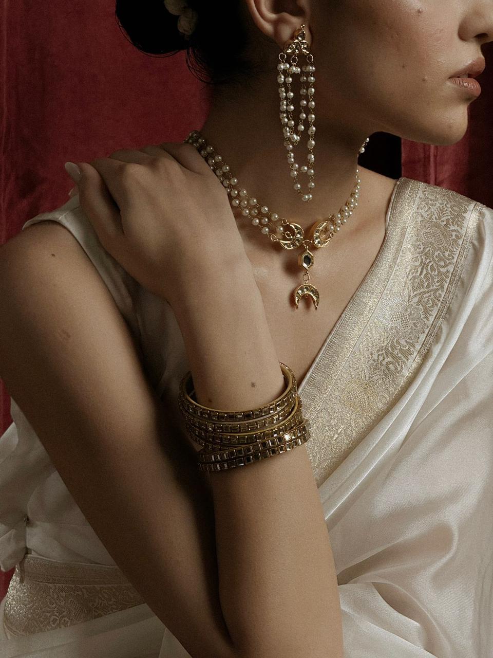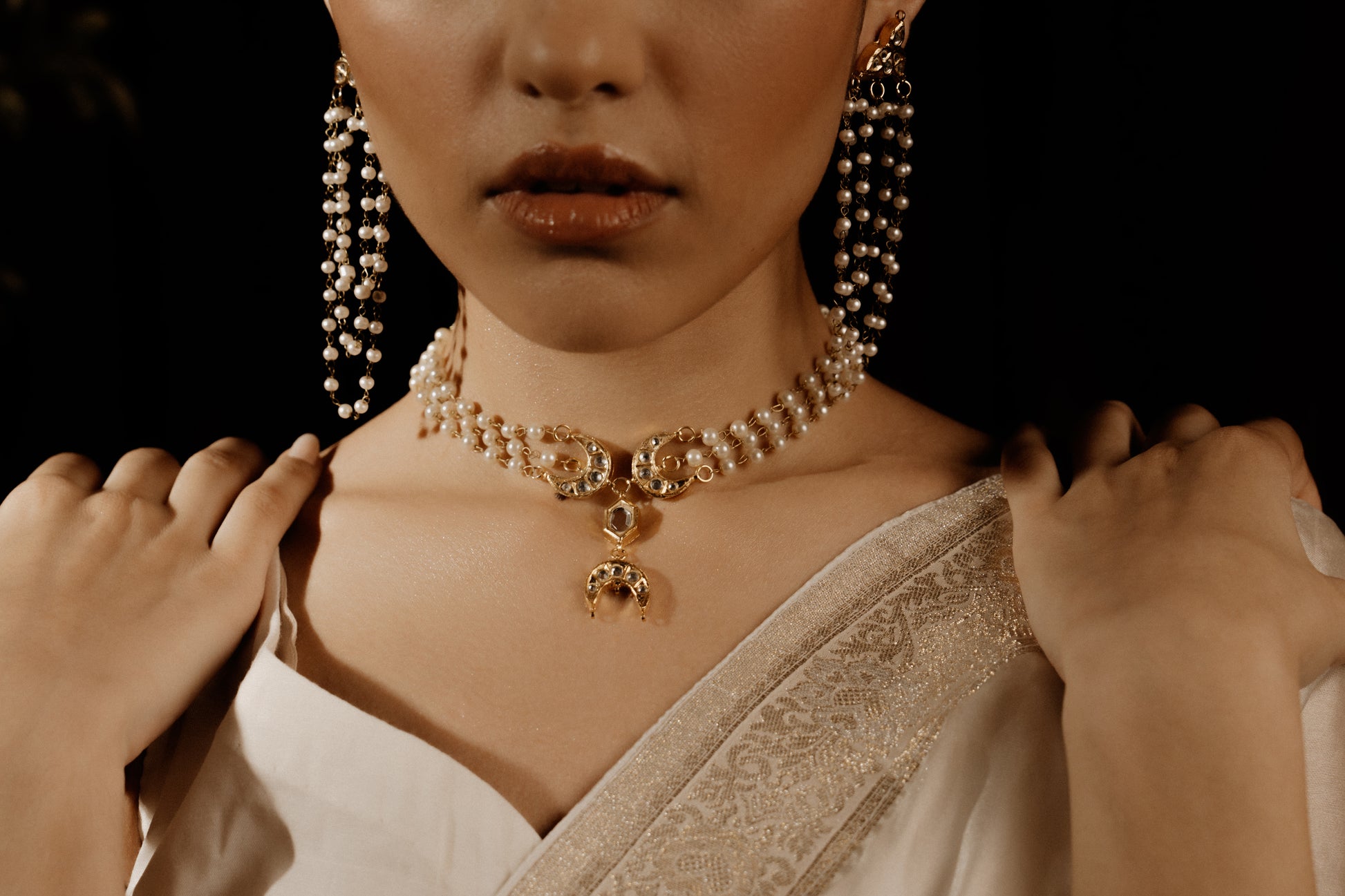 A versatile piece that can be worn as a choker or necklace. Handcrafted and gold-plated, it showcases intricate Kundan detailing and is adorned with cultured pearls. The drawstring closure ensures a customizable, comfortable fit for any occasion.