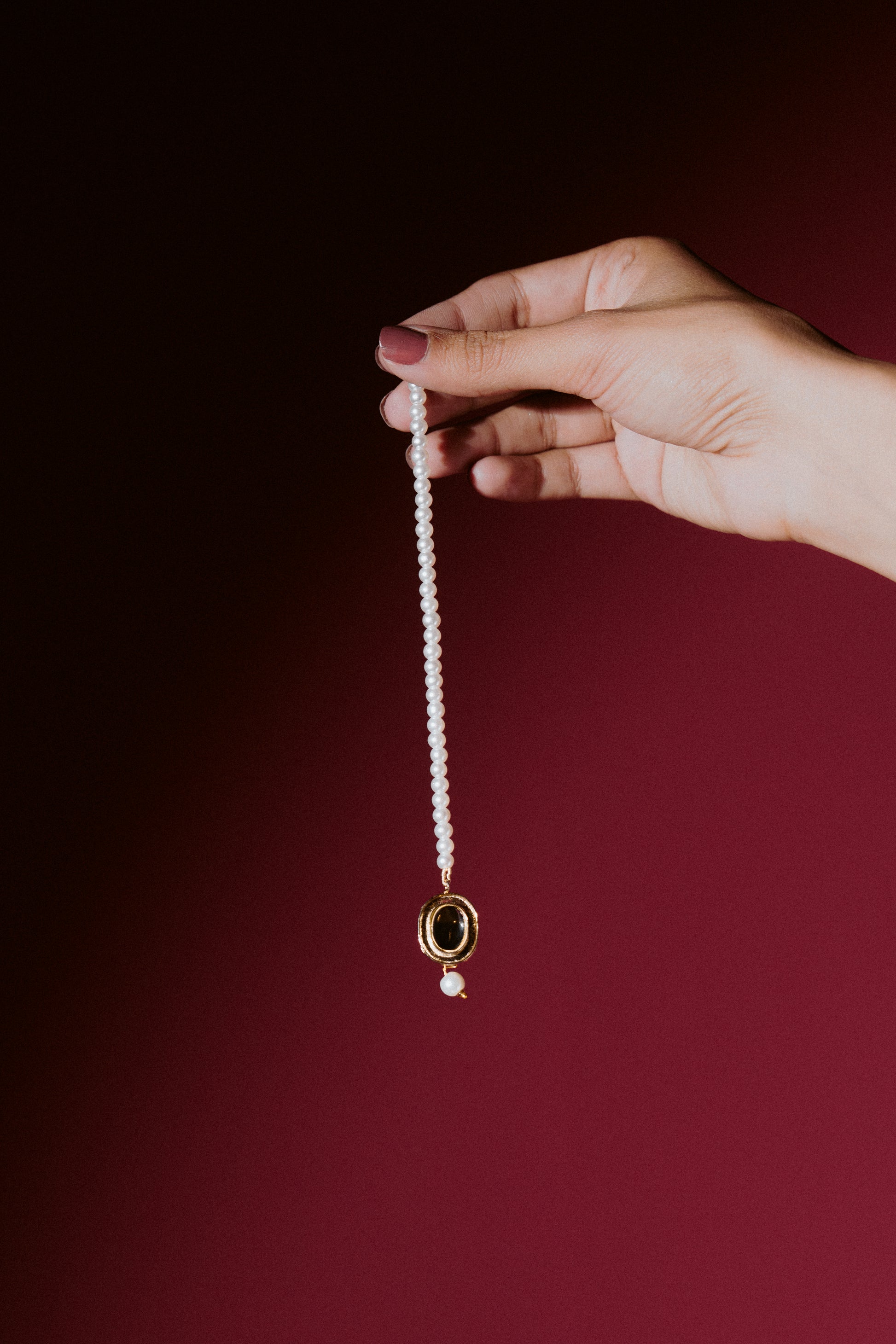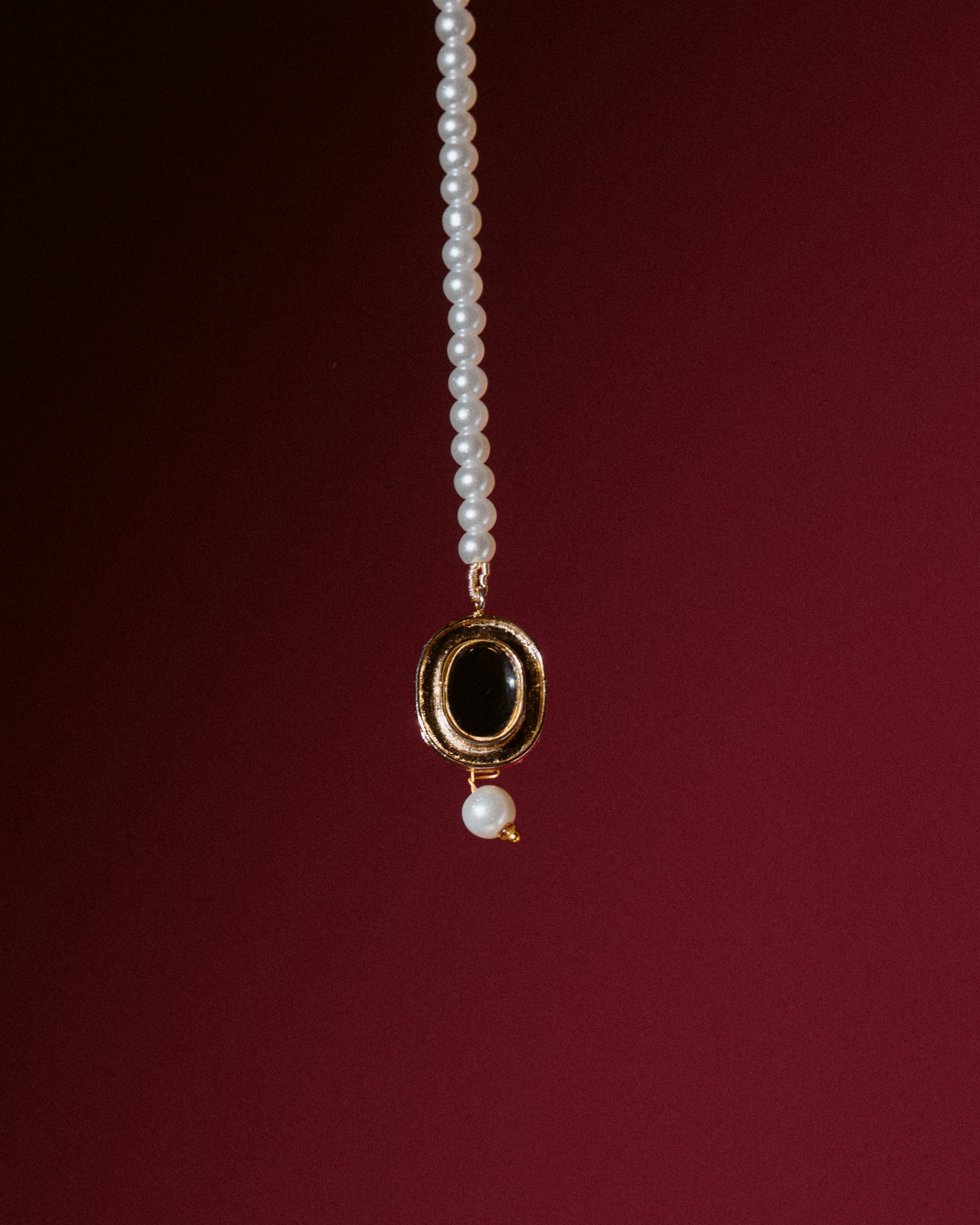 Hand-strung with delicate pearls and finished with a bold oval mirror stone framed in antique gold.