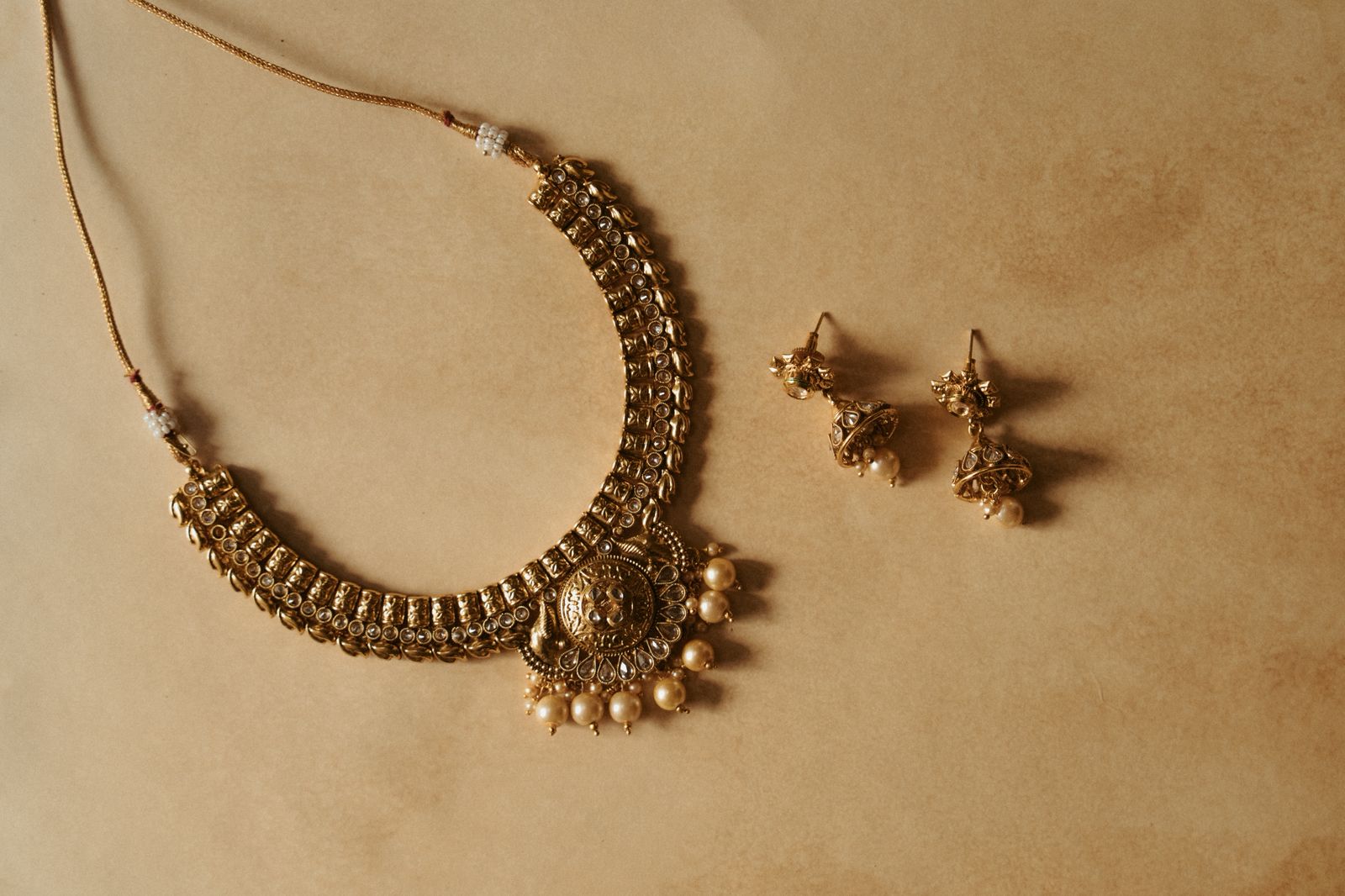 A regal Rajwari choker in antique gold, adorned with intricate detailing and pearl drops, paired with matching jhumkas for a timeless royal look.