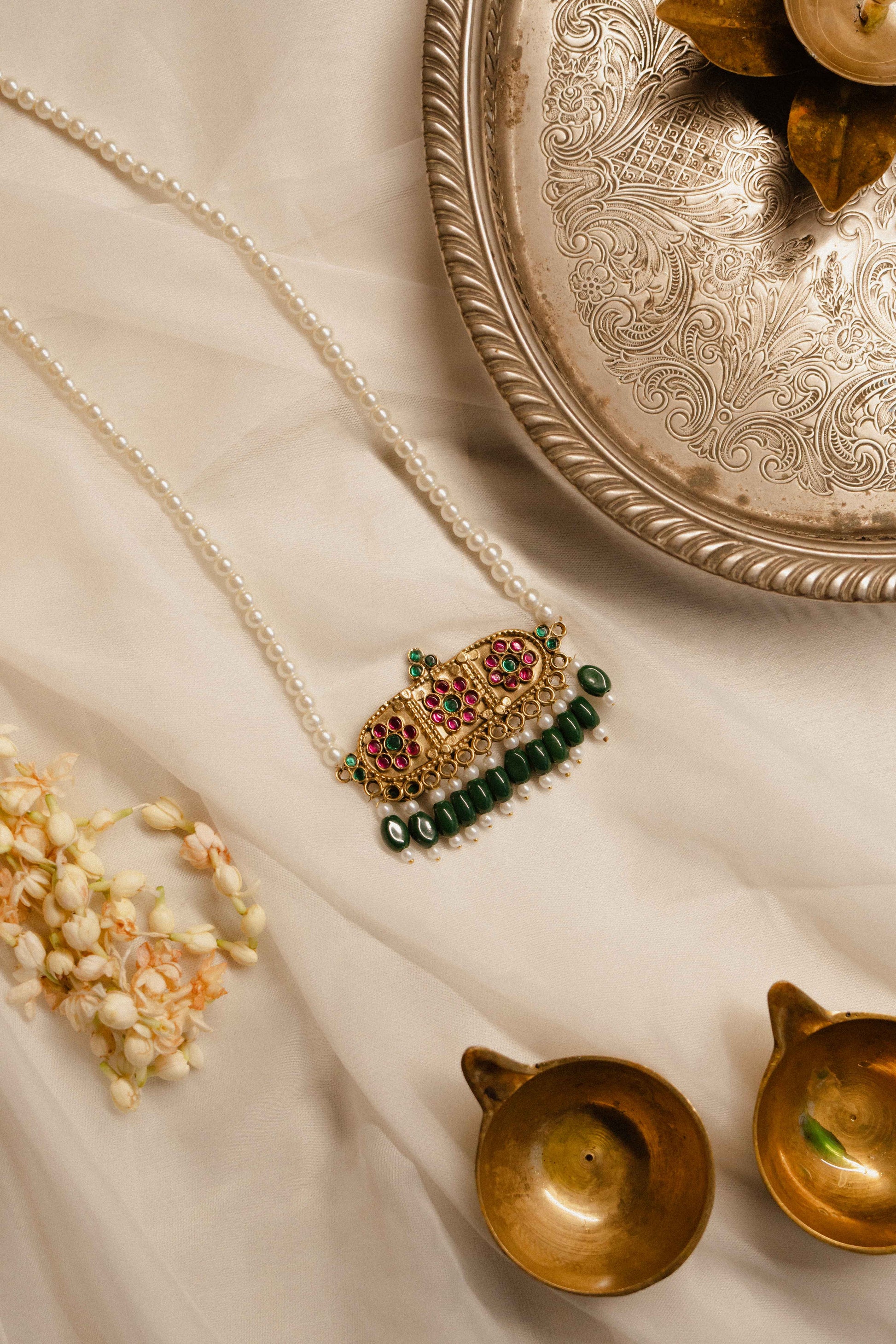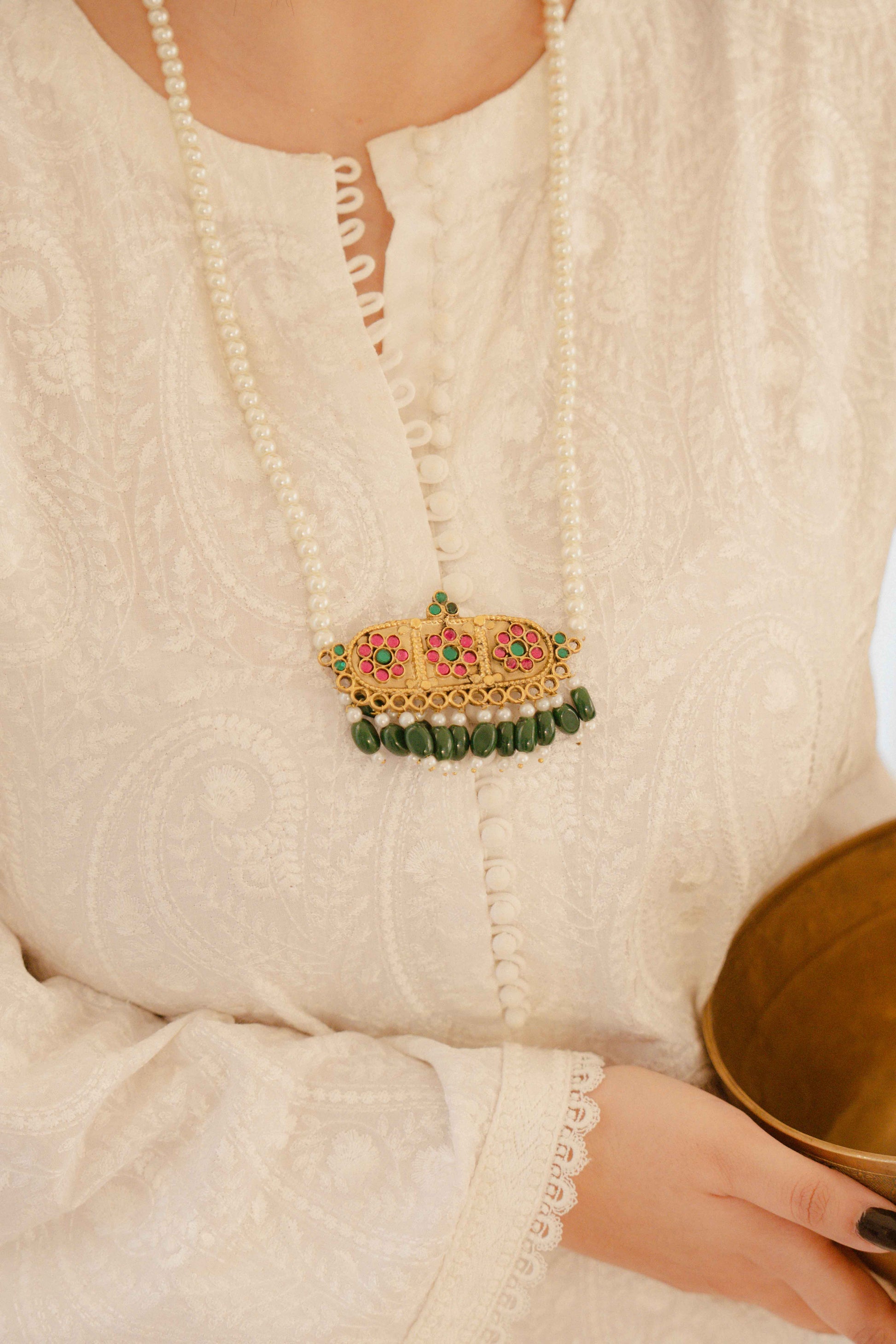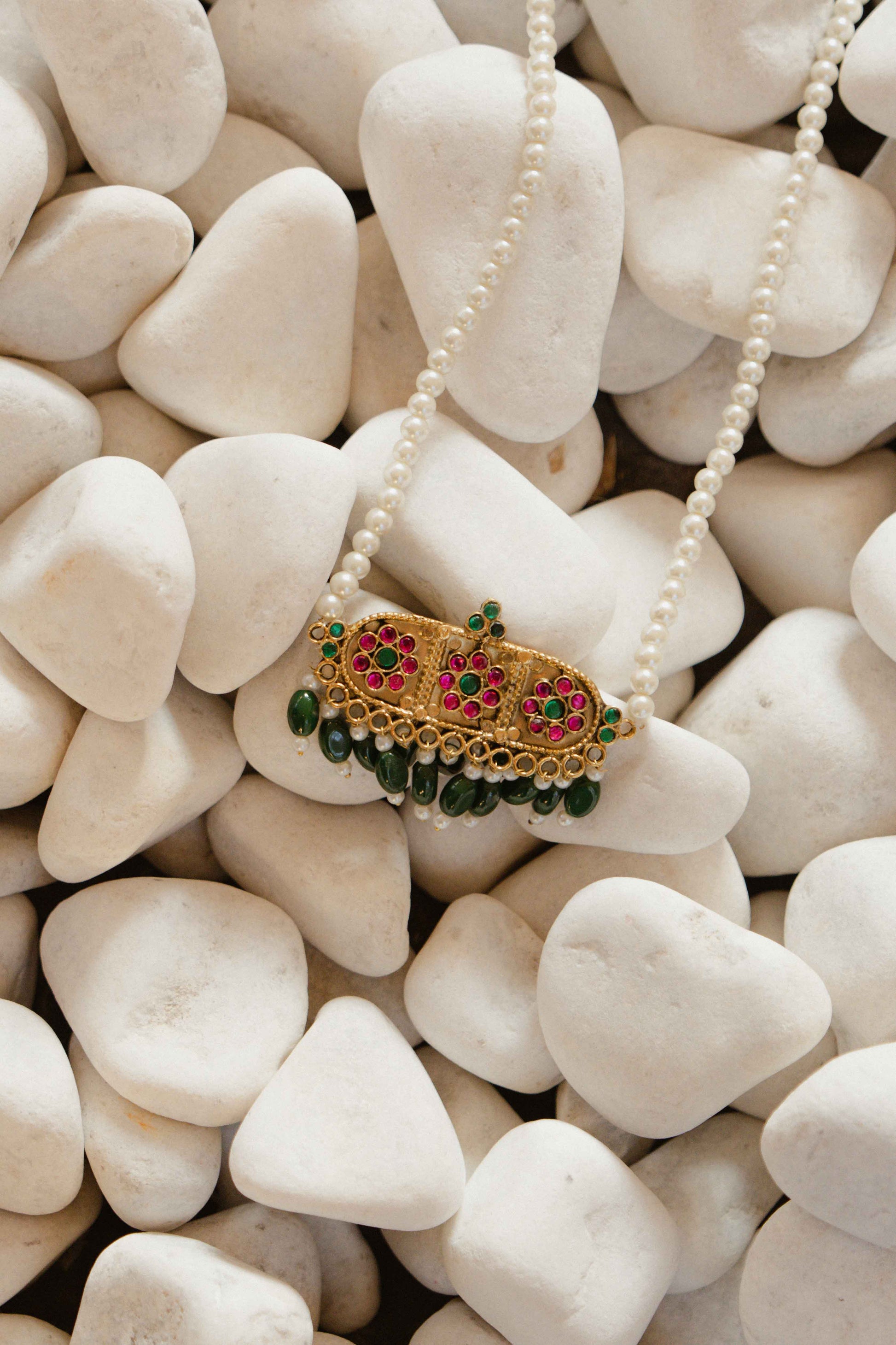 This Mala is crafted using traditional Kundan Jadau techniques, where uncut gemstones are carefully hand-set into a gold base using fine gold foil - involving precise hand-embossing and embellishment.