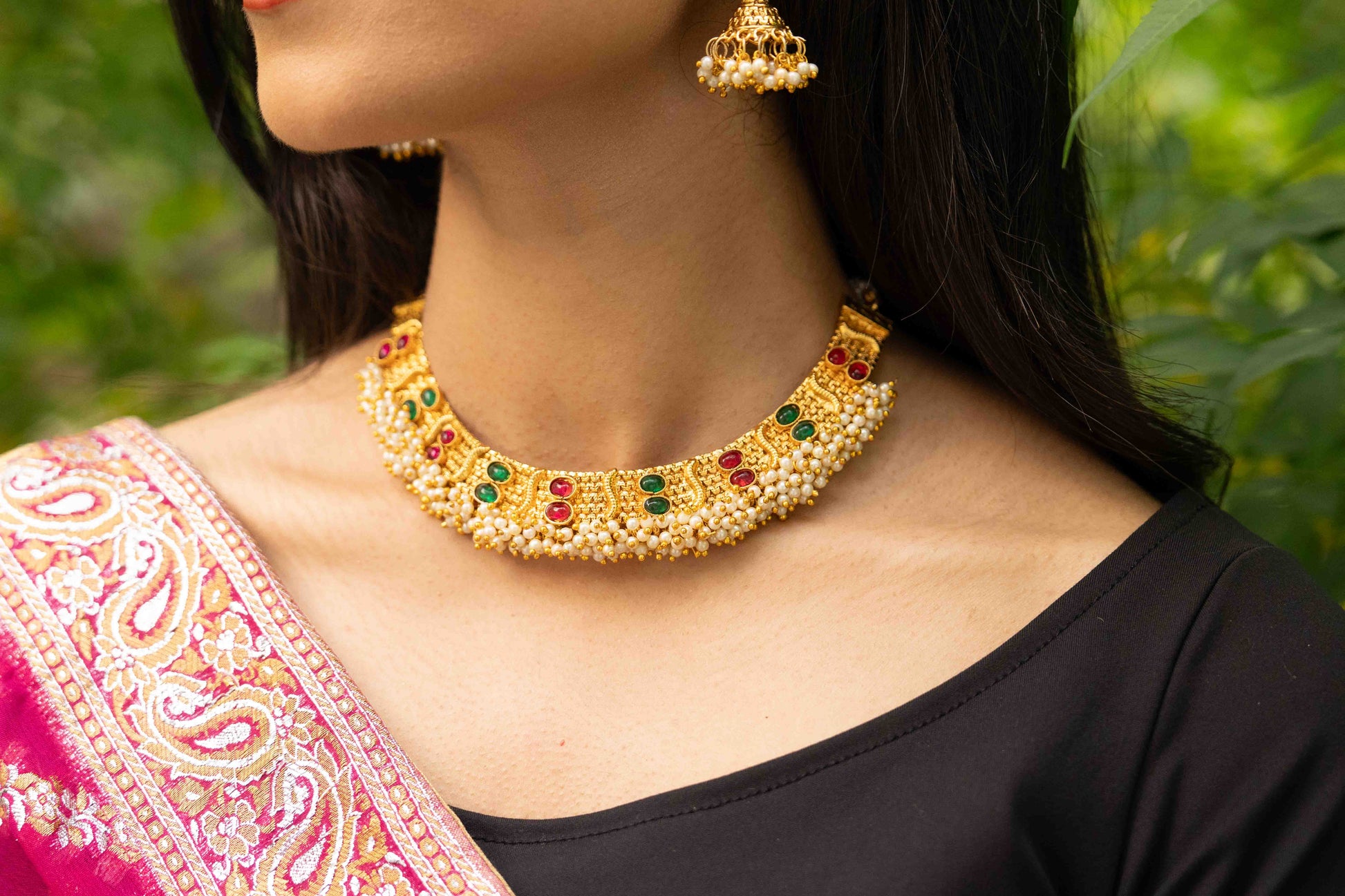 A regal choker in antique gold, embellished with pink and green stones, delicate pearl clusters, and intricate detailing, paired with matching earrings for a timeless festive look.