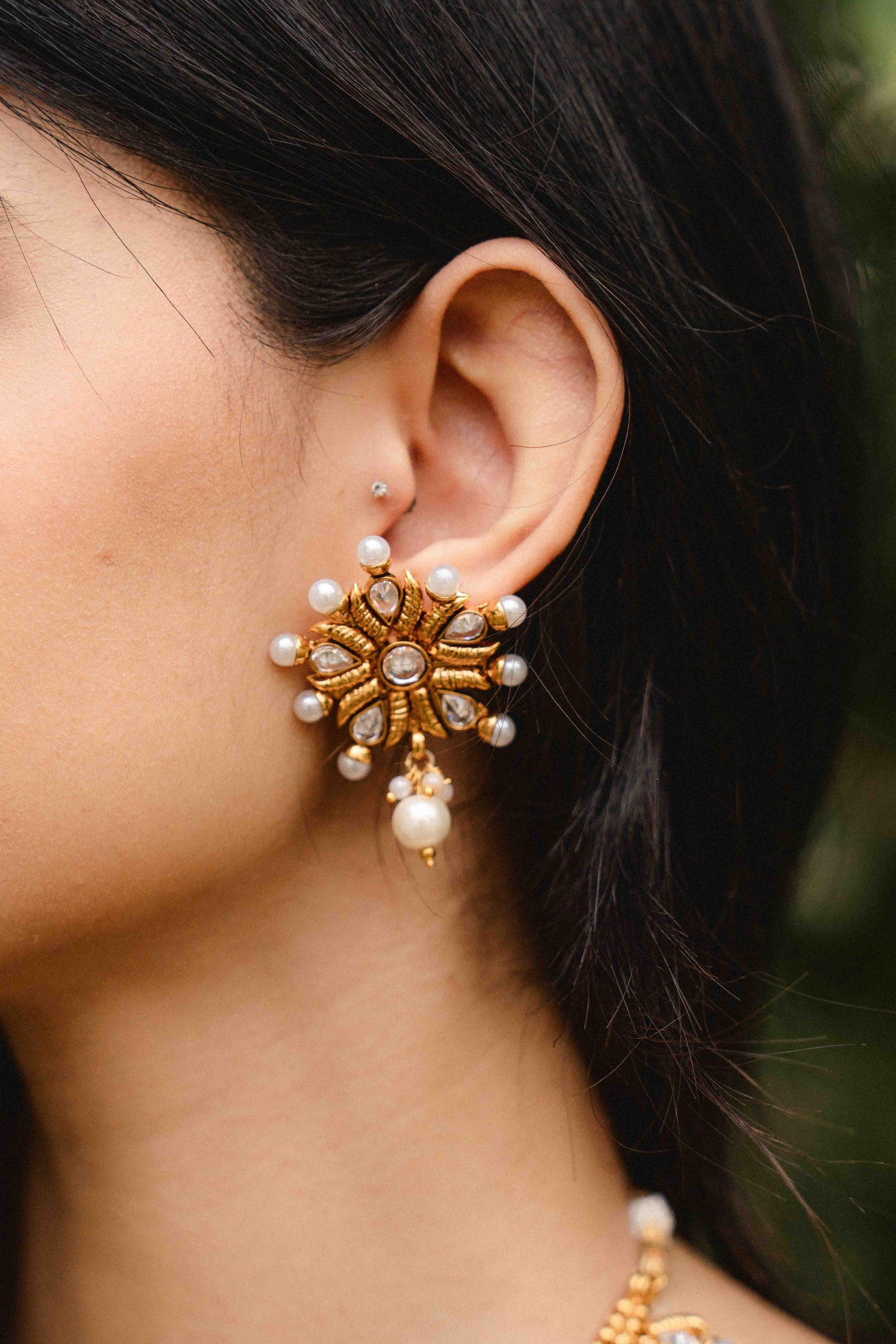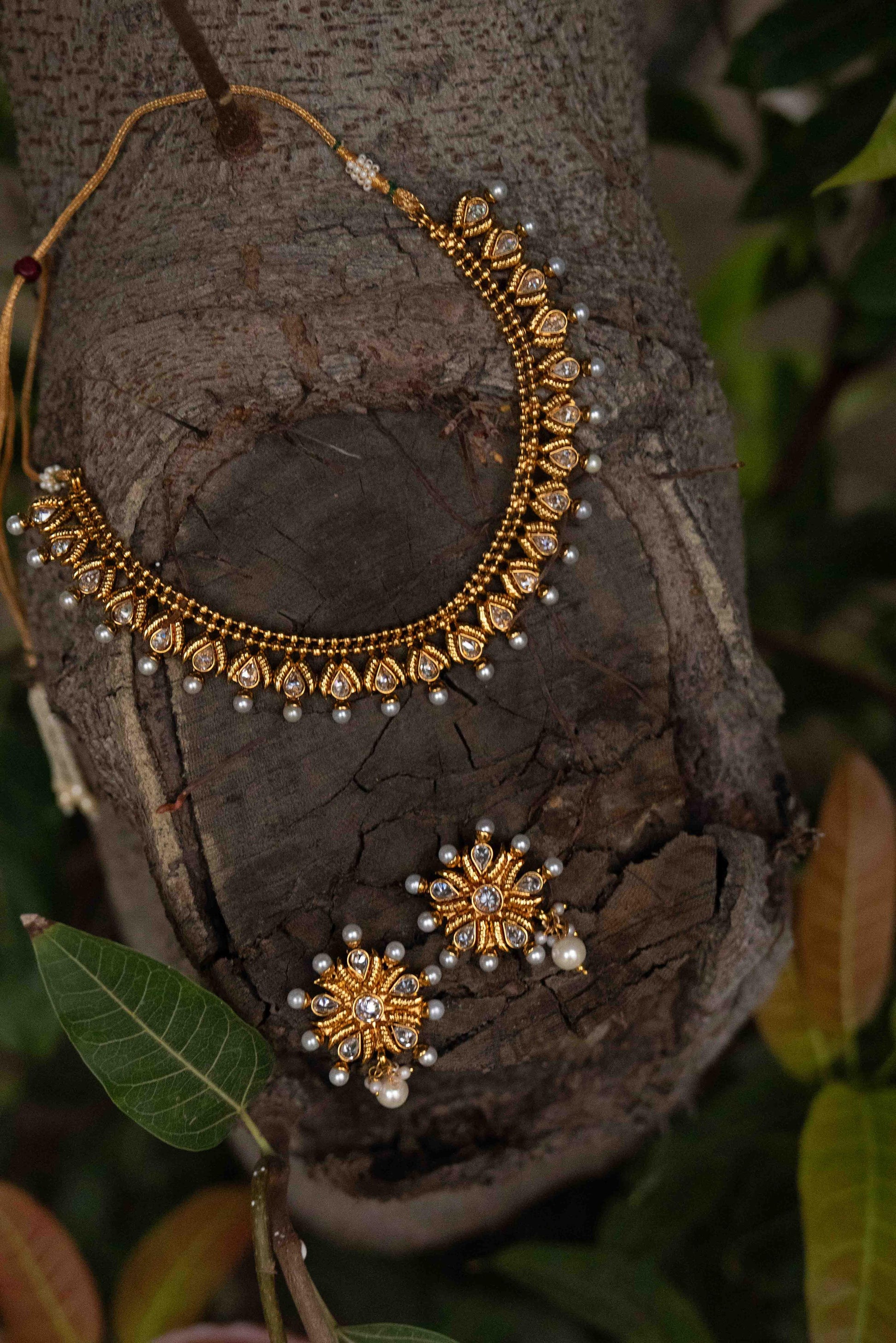 Rajwari choker in antique gold, adorned with intricate detailing and pearl drops, paired with matching earrings for a timeless royal look.