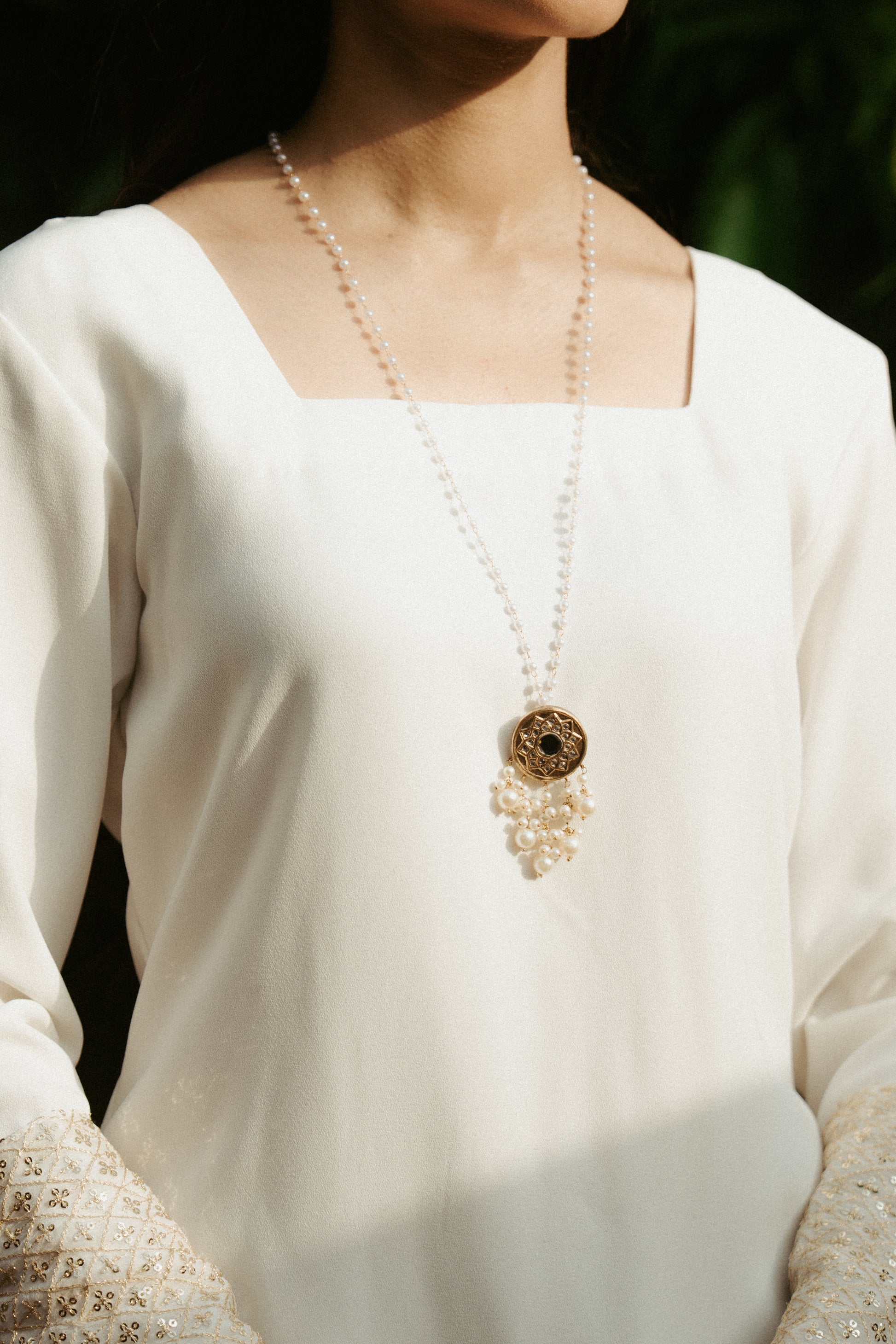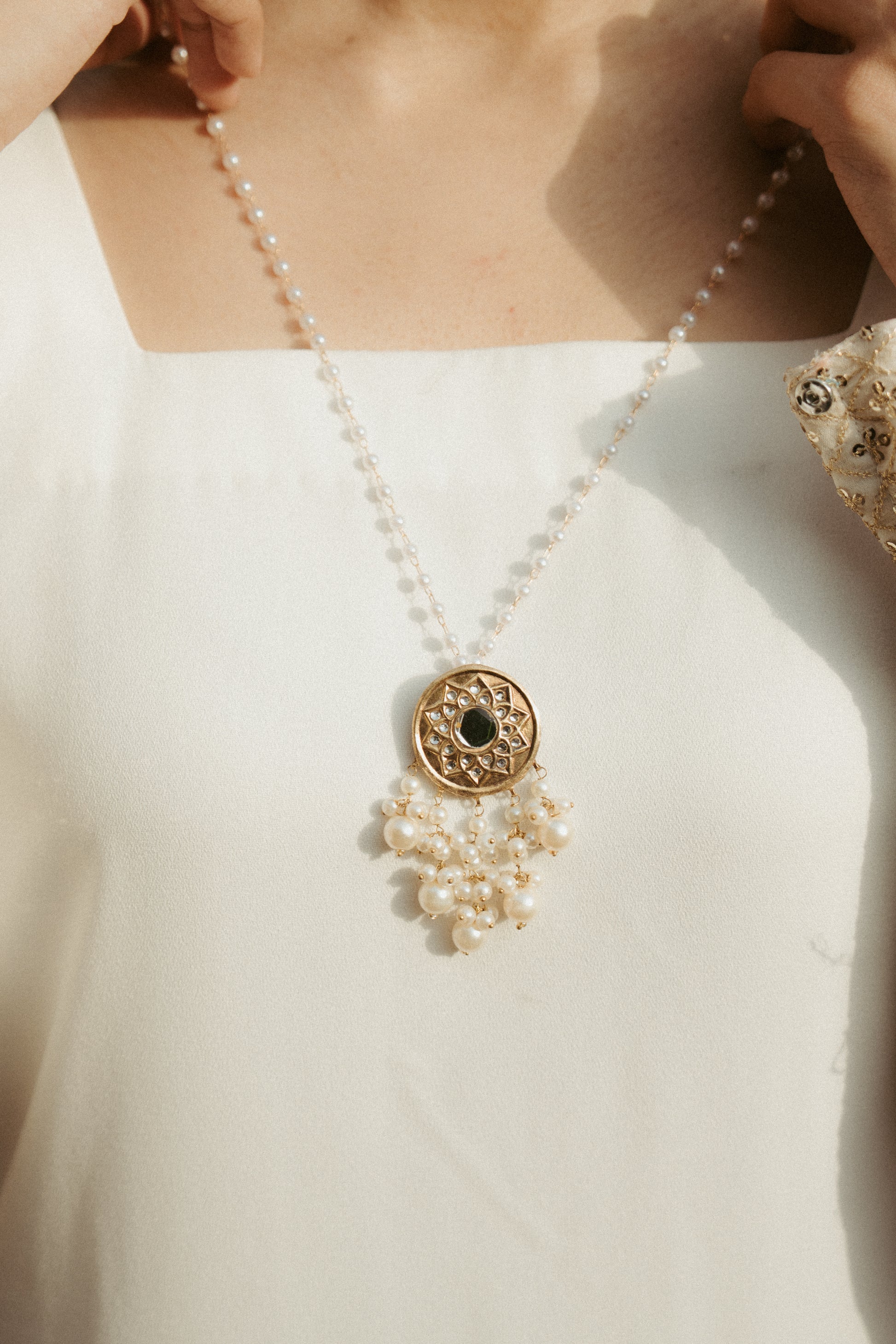 A delicate pearl-beaded mala featuring a gold-toned pendant with intricate kundan work and cascading pearl drops, exuding timeless elegance and understated charm. Perfect for layering or wearing solo for a graceful traditional touch.