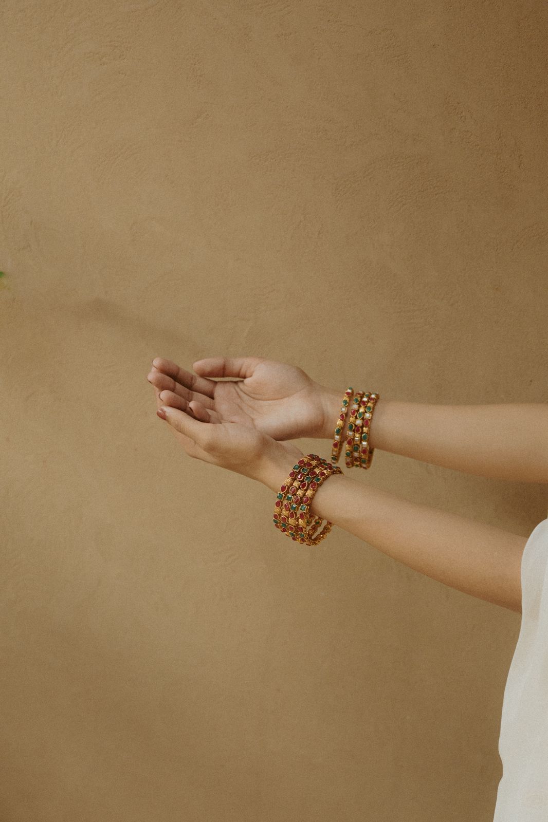 Set of four karra's gold-plated kangan adorned with hand-set red and green stones in traditional jadau style
