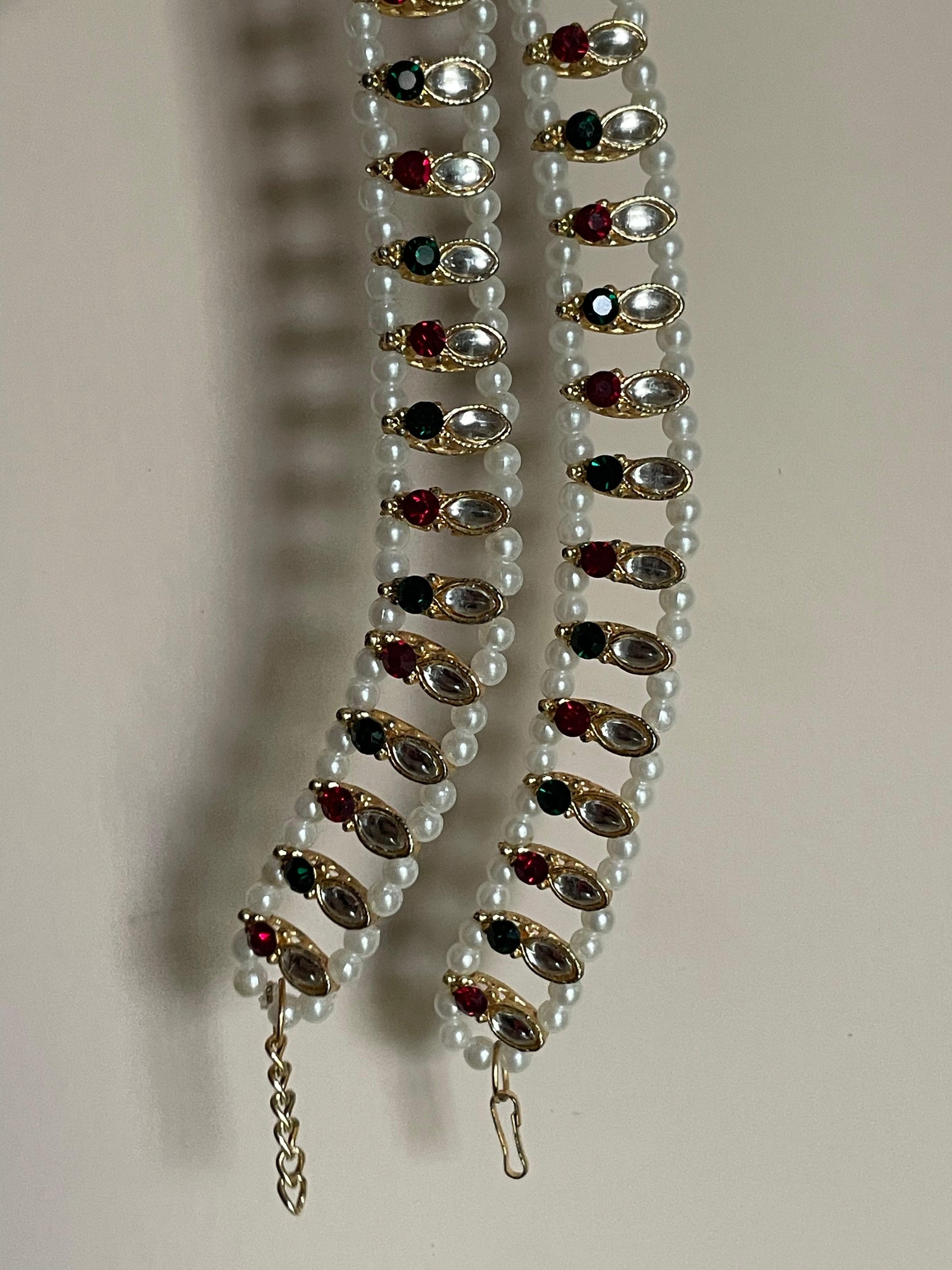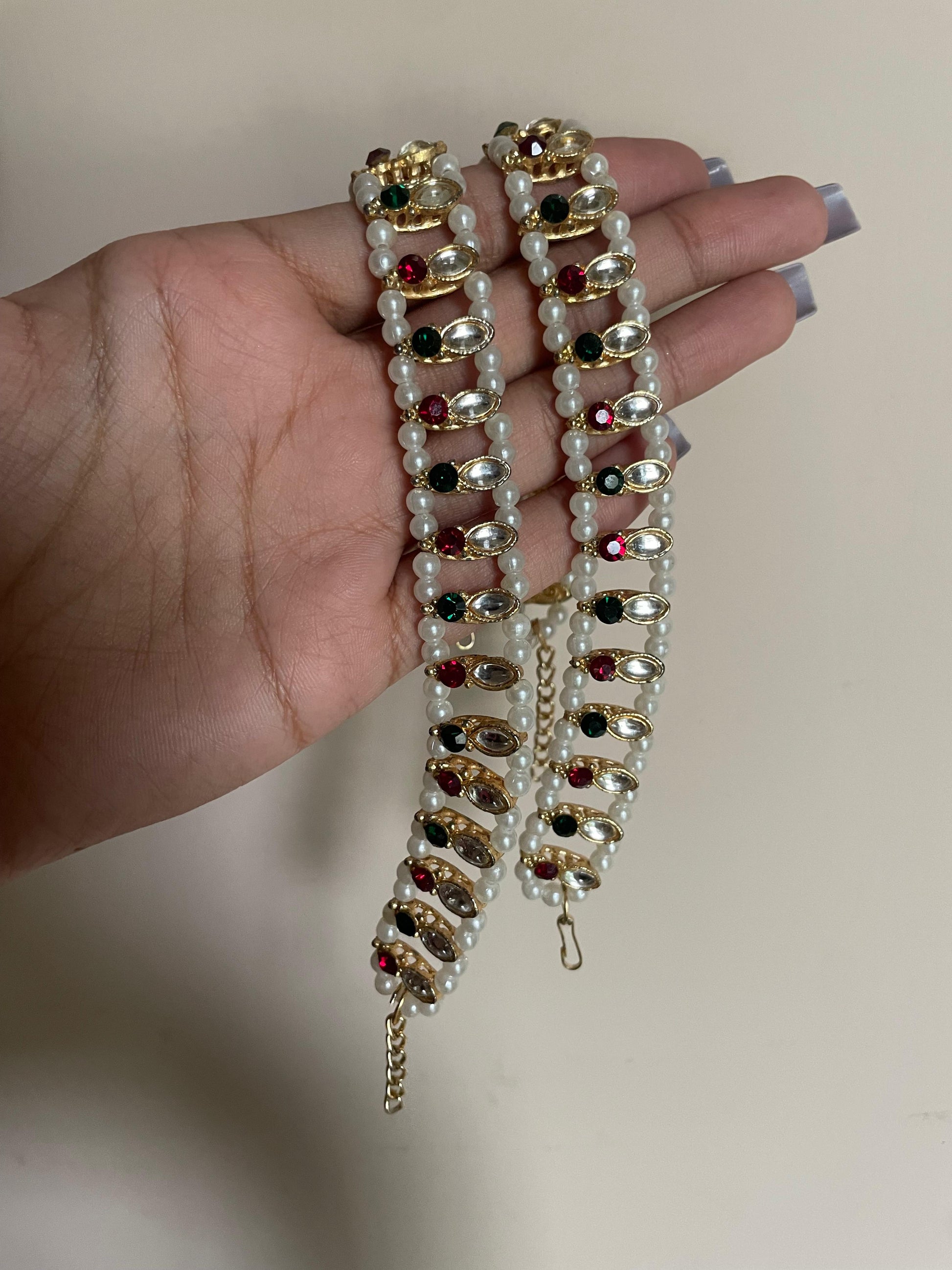 These anklets feature rows of pearl beads paired with multicolored kundan stones in gold settings. (Pair of two)