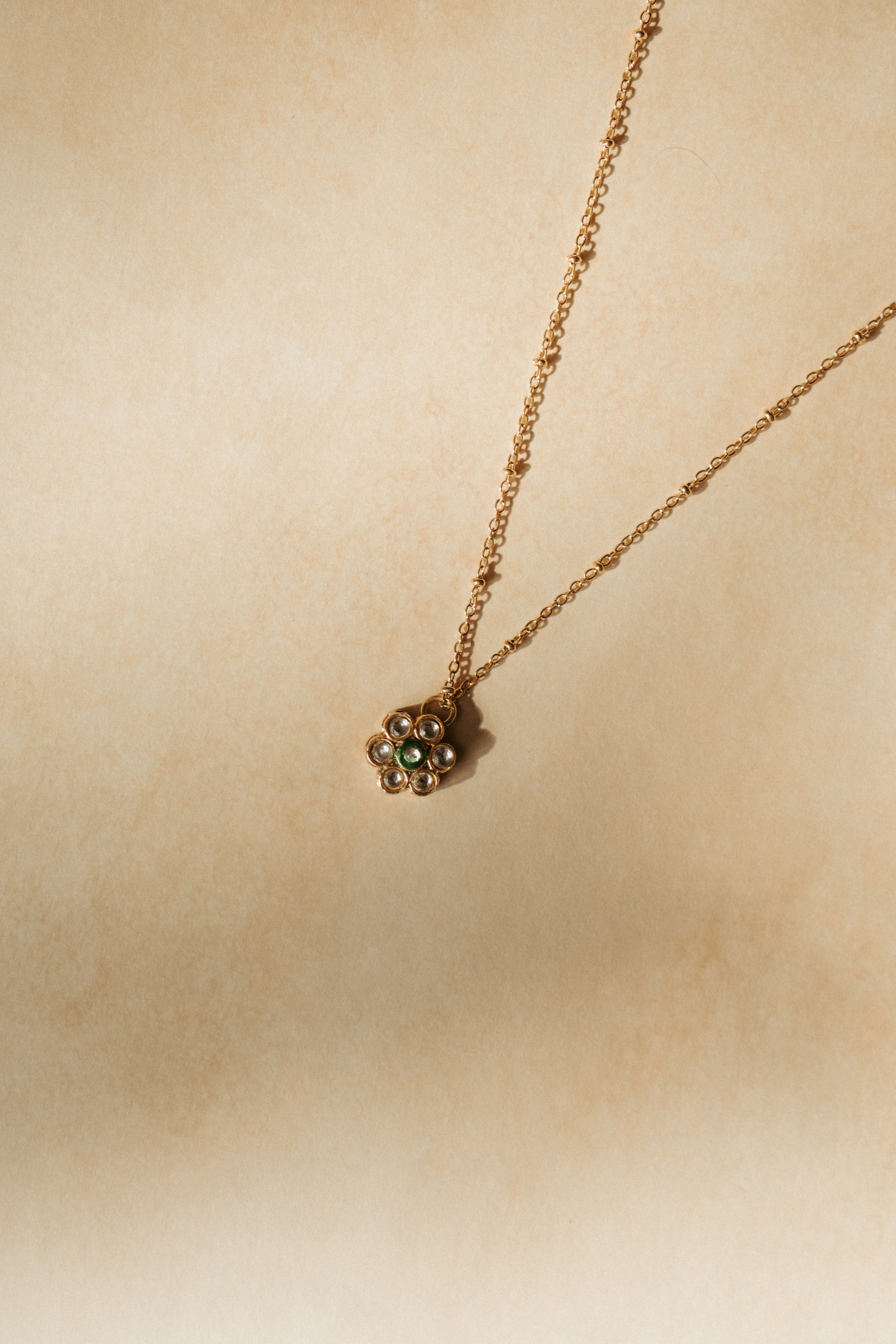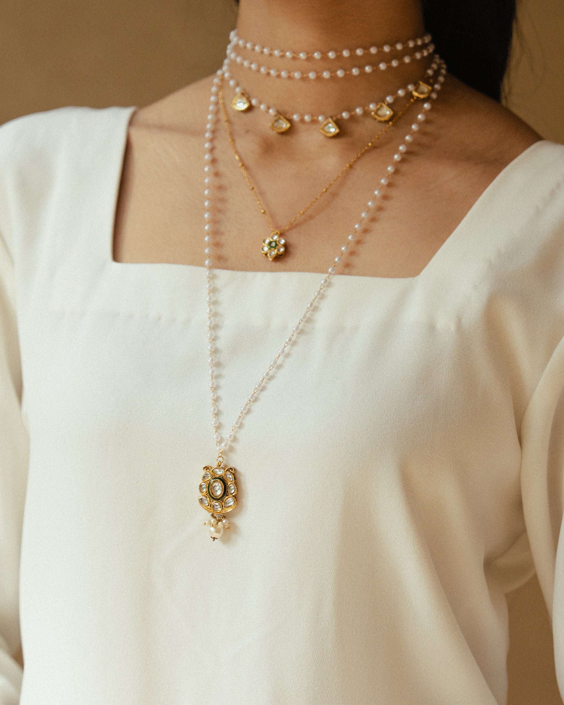 A kundan necklace featuring a delicate flower-shaped pendant, framed in gold tones.