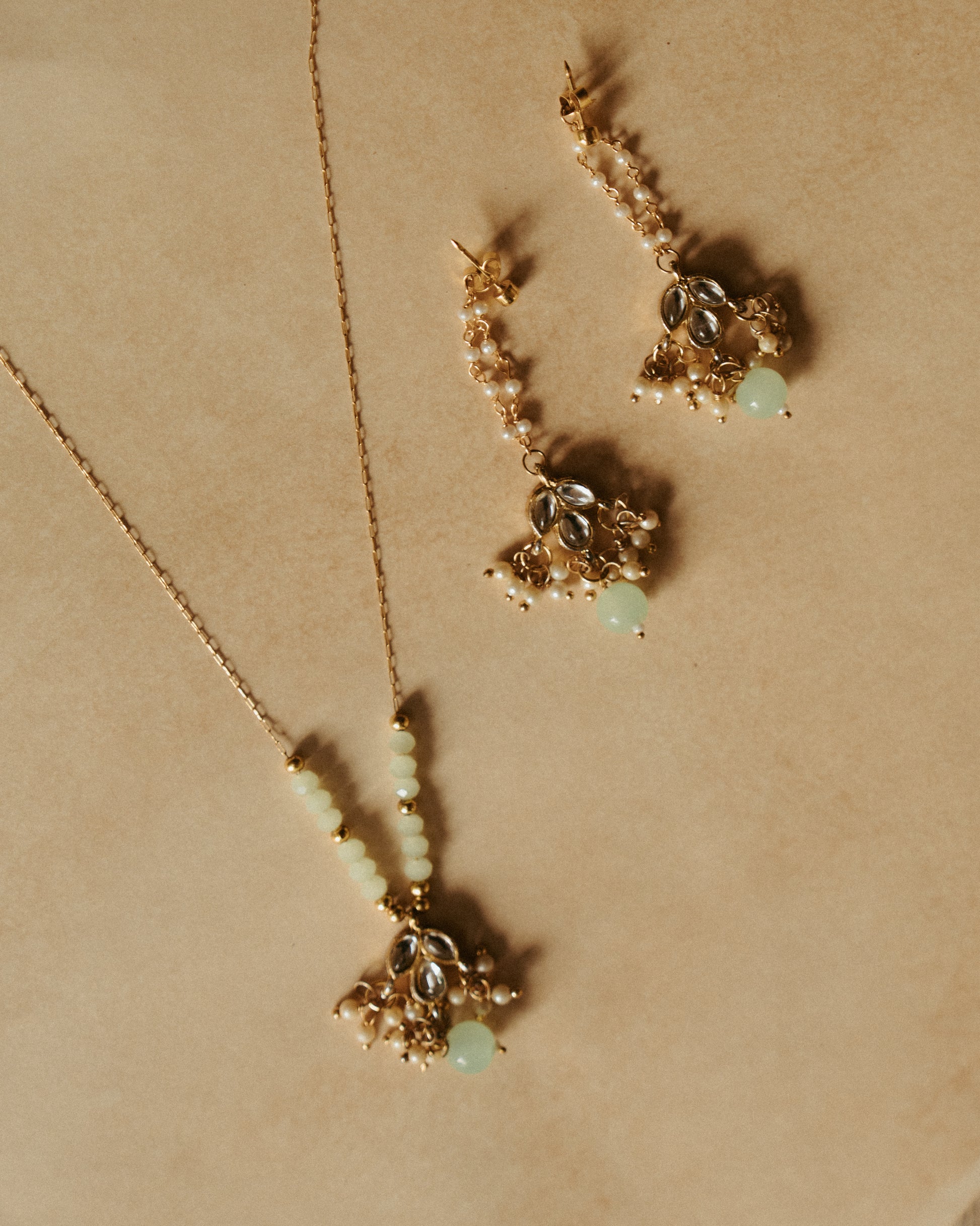 A fine beaded chain necklace featuring a kundan-inspired pendant with pearl accents and a pale jade drop. Lightweight and versatile, perfect to wear solo or layered for a statement look.