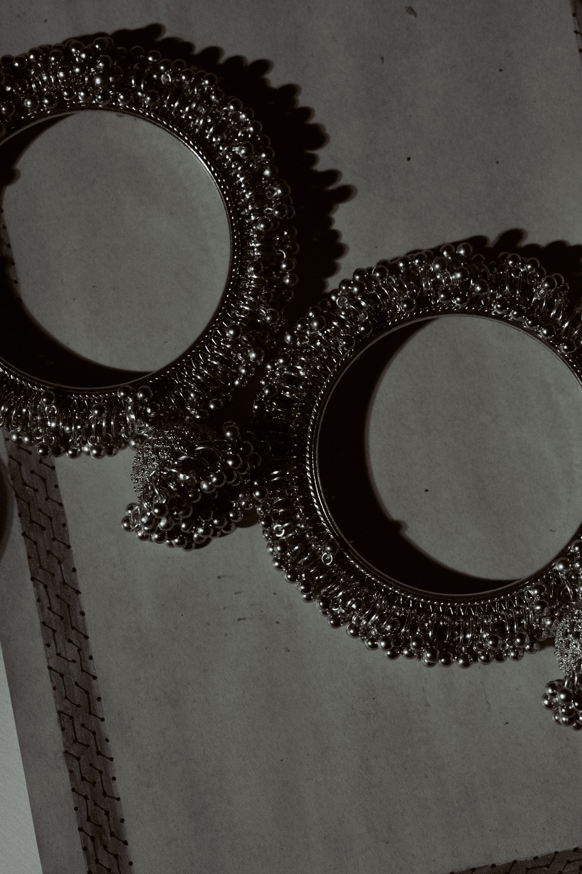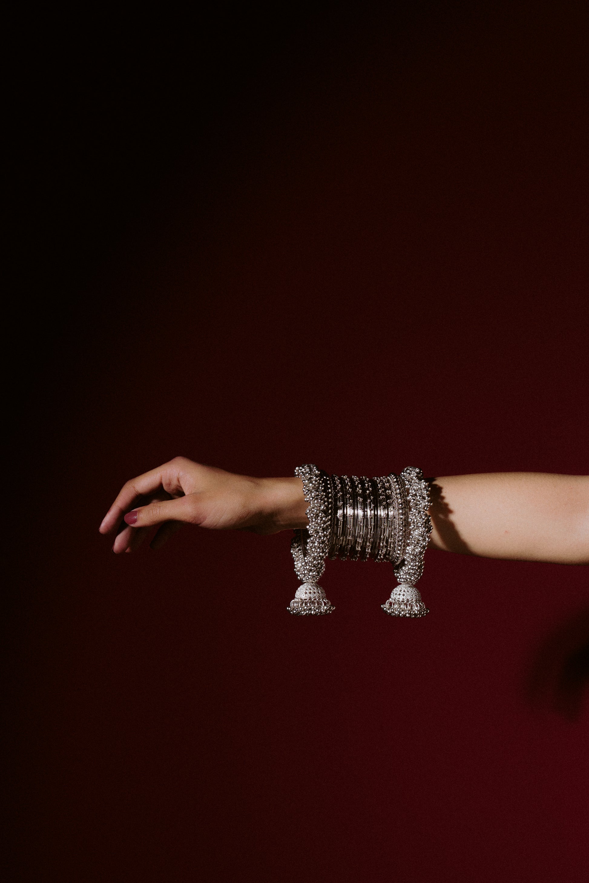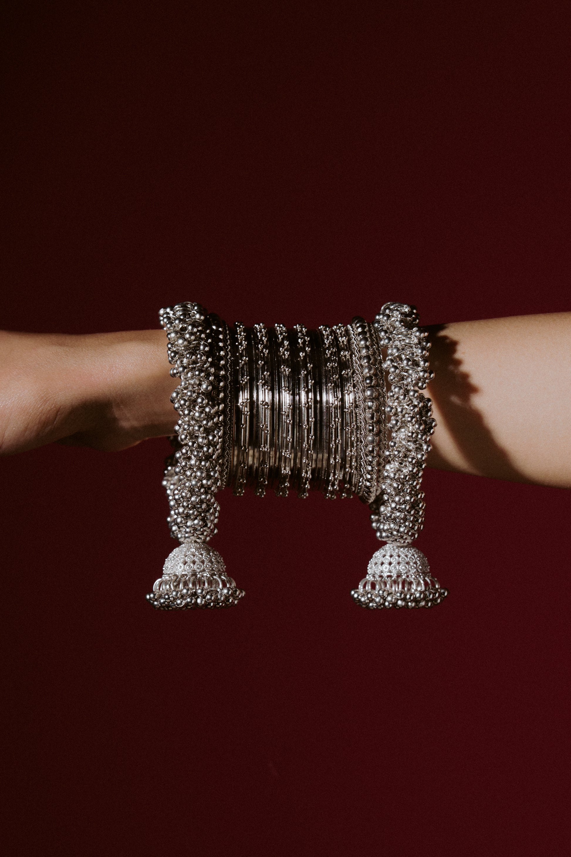 Crafted in oxidized silver tones - layered with intricate beading, stacked bangles, and bold ghungroo jhumkis.