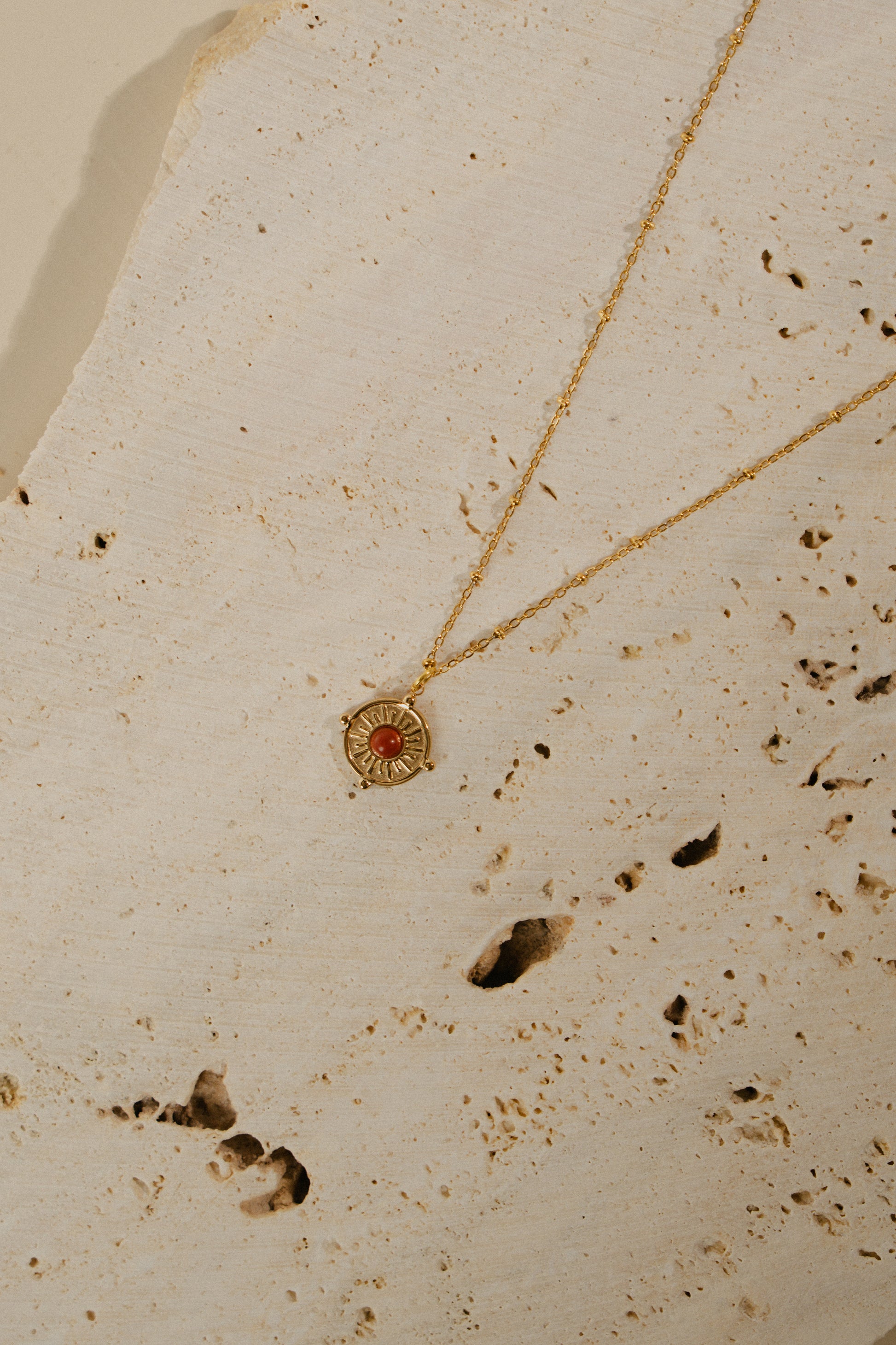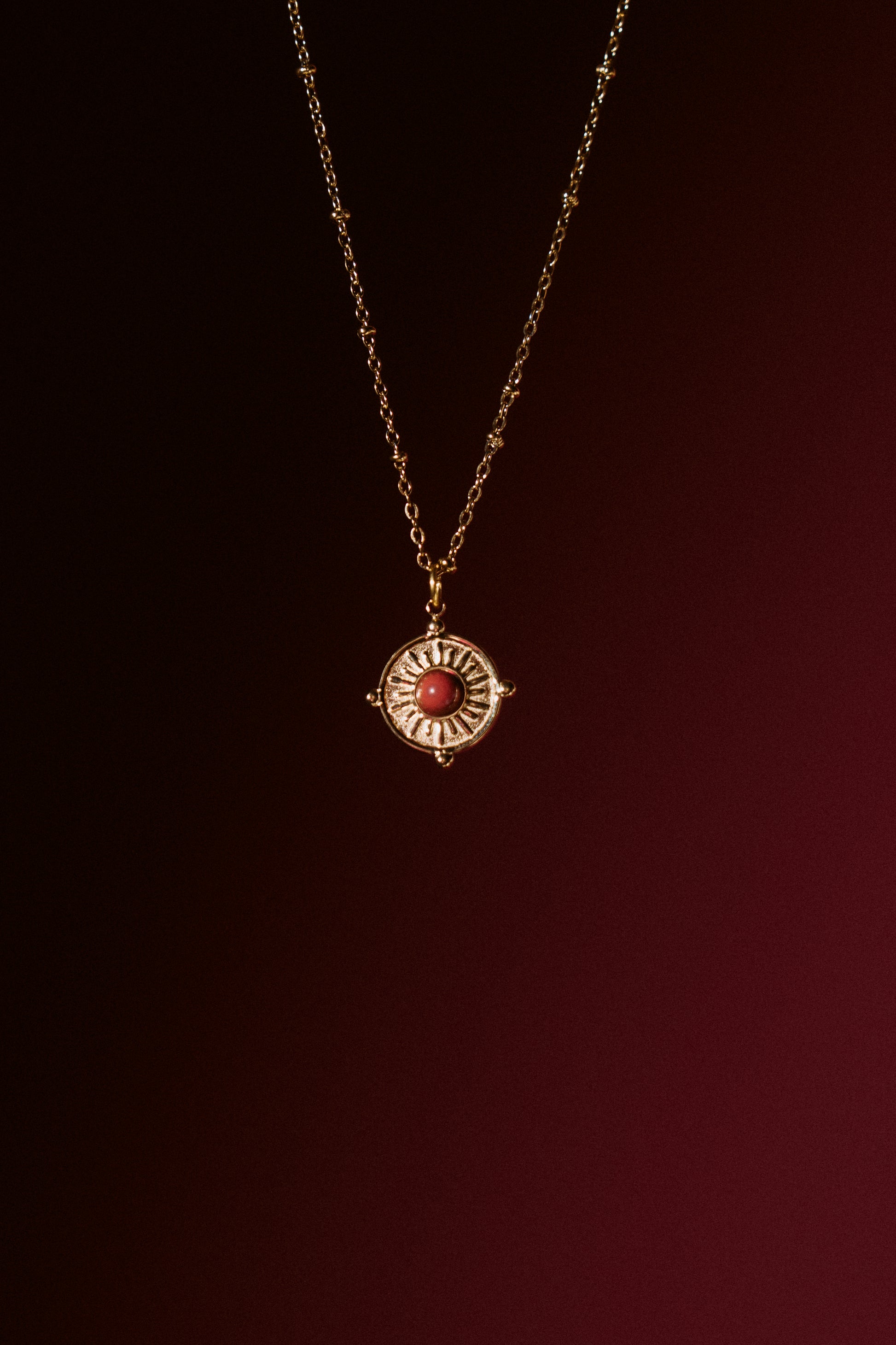 A gold-toned pendant with a deep red center. Simple, striking, and easy to wear every day.