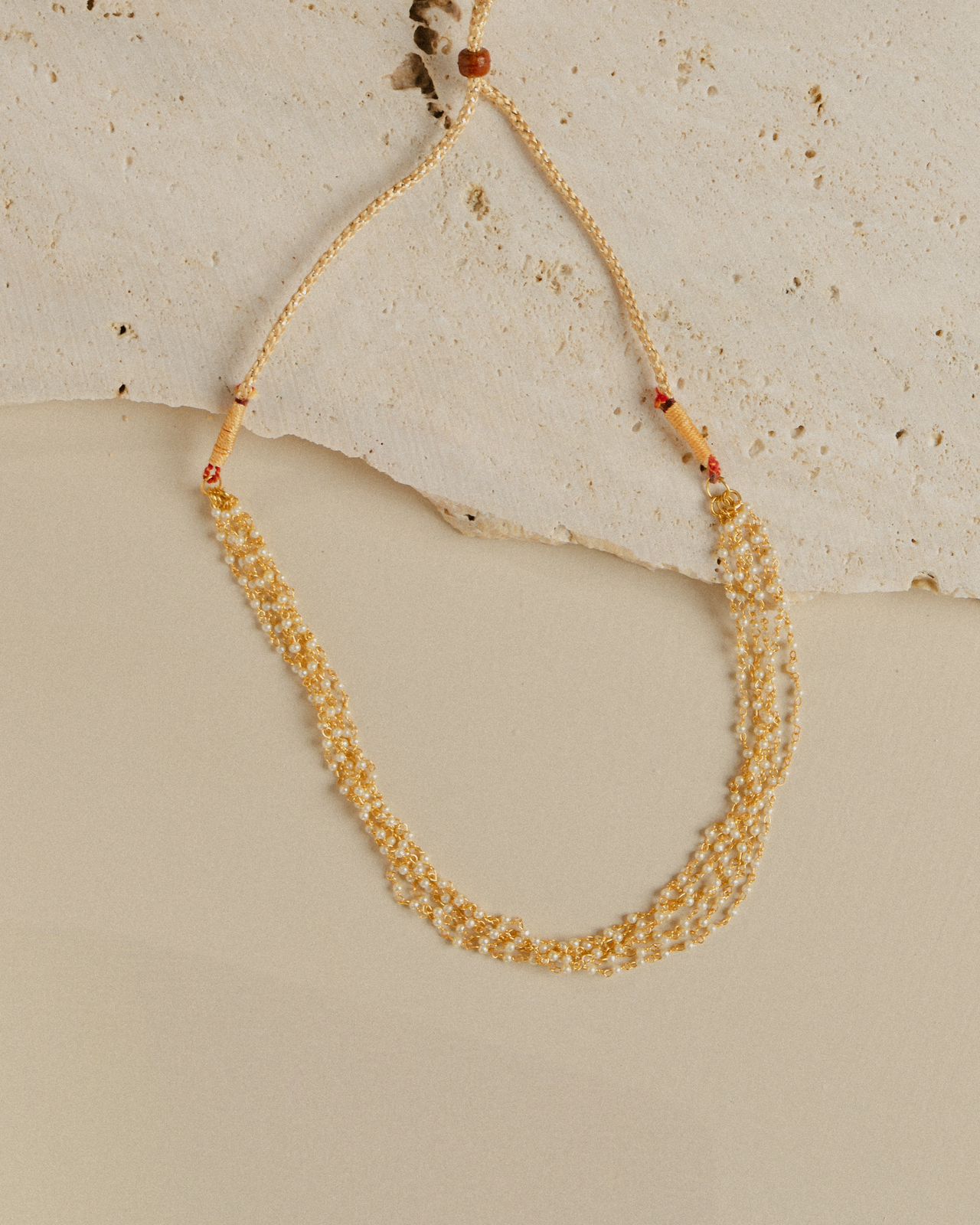 Gold-plated Indian chain choker featuring multi-strand beaded detailing. Perfect for layering or wearing solo, the choker rests gracefully along the collarbone - ideal for both festive occasions and everyday minimal look. Adjustable dori closure with hand-wrapped ends ensures a comfortable fit for all.