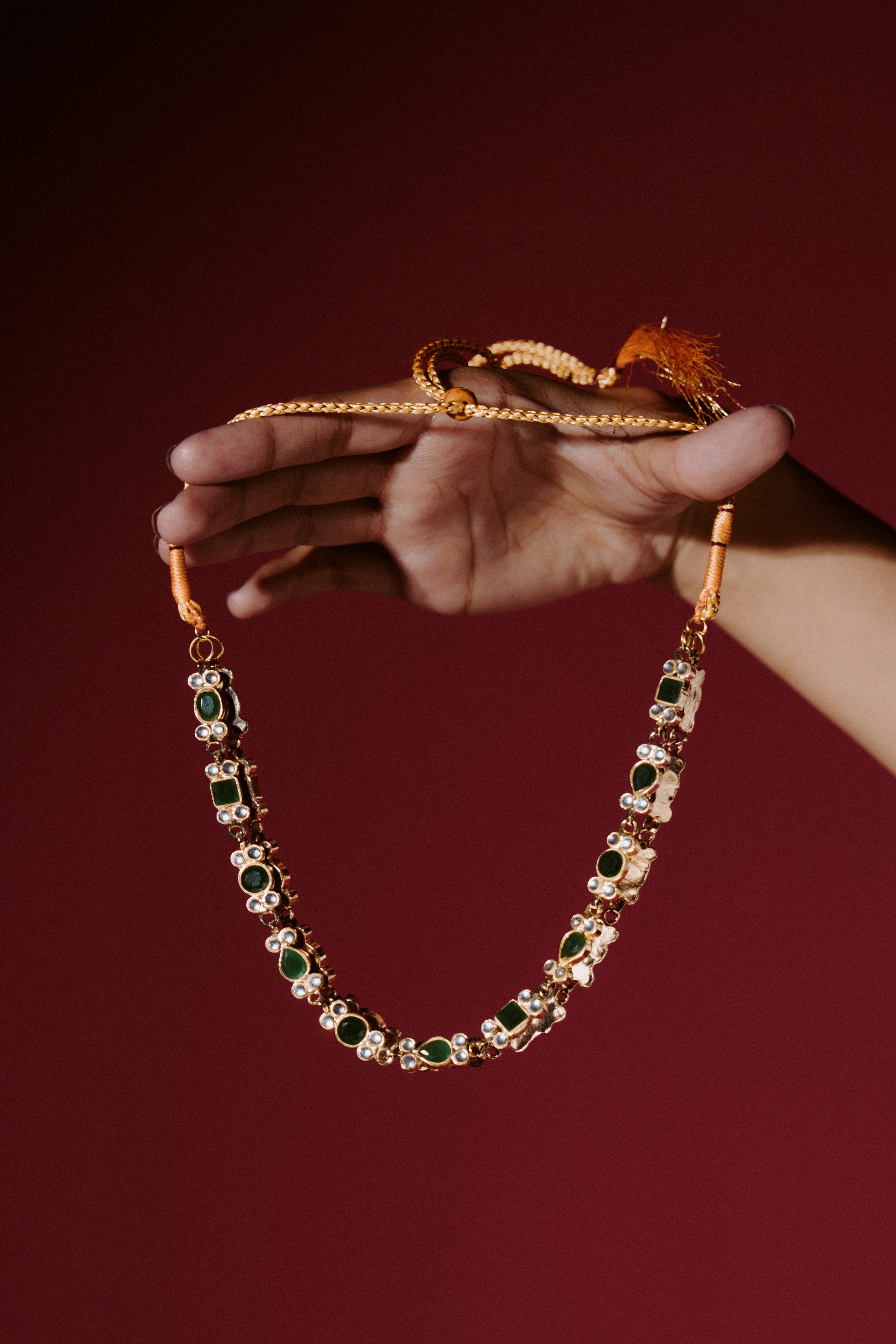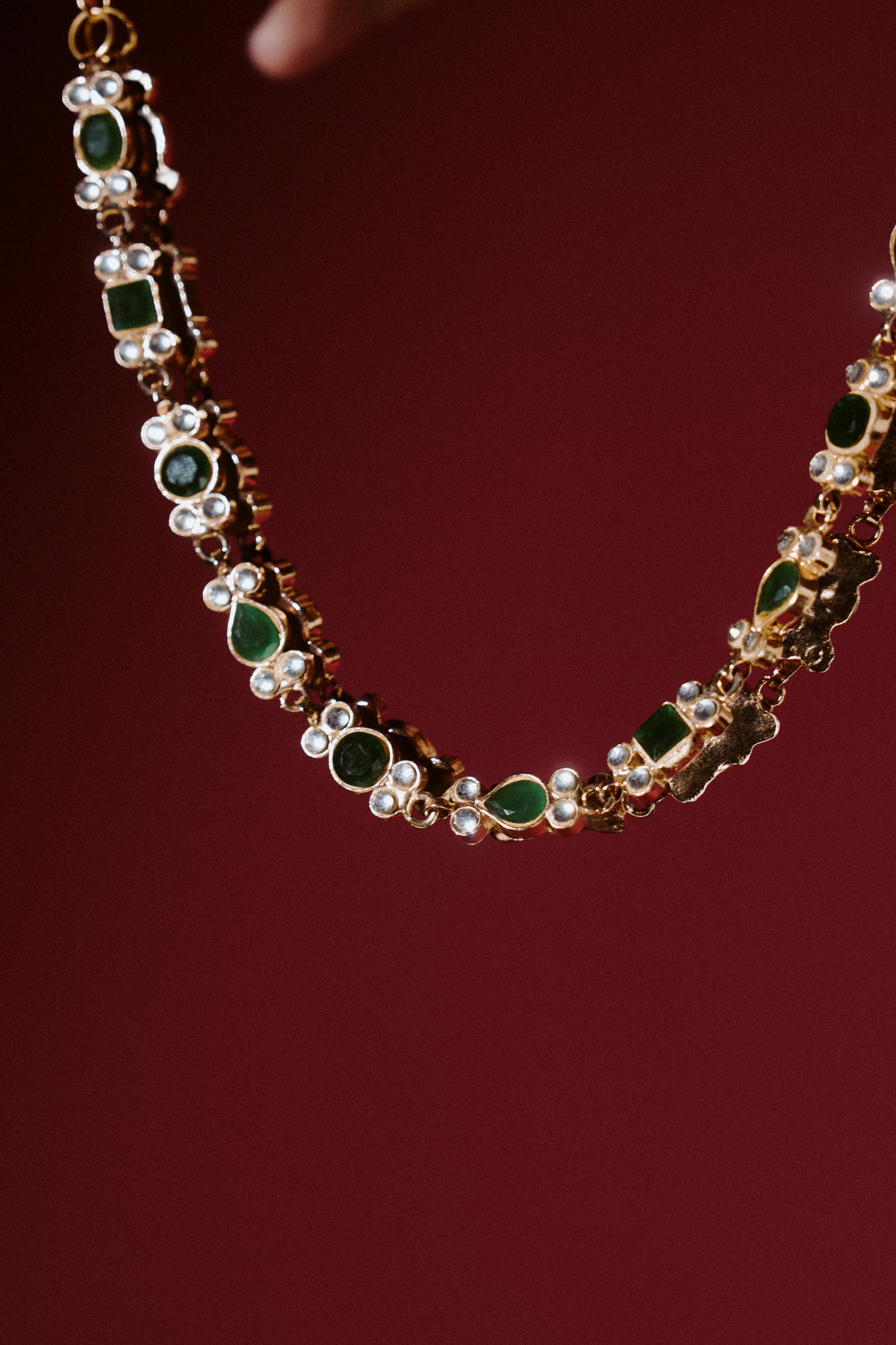 Handcrafted choker with deep green stones set in symmetrical rows of gold-polished frames. The dual-layer design, delicately embellished with miniature Kundan-style motifs, creates a regal silhouette that rests softly along the collarbone.