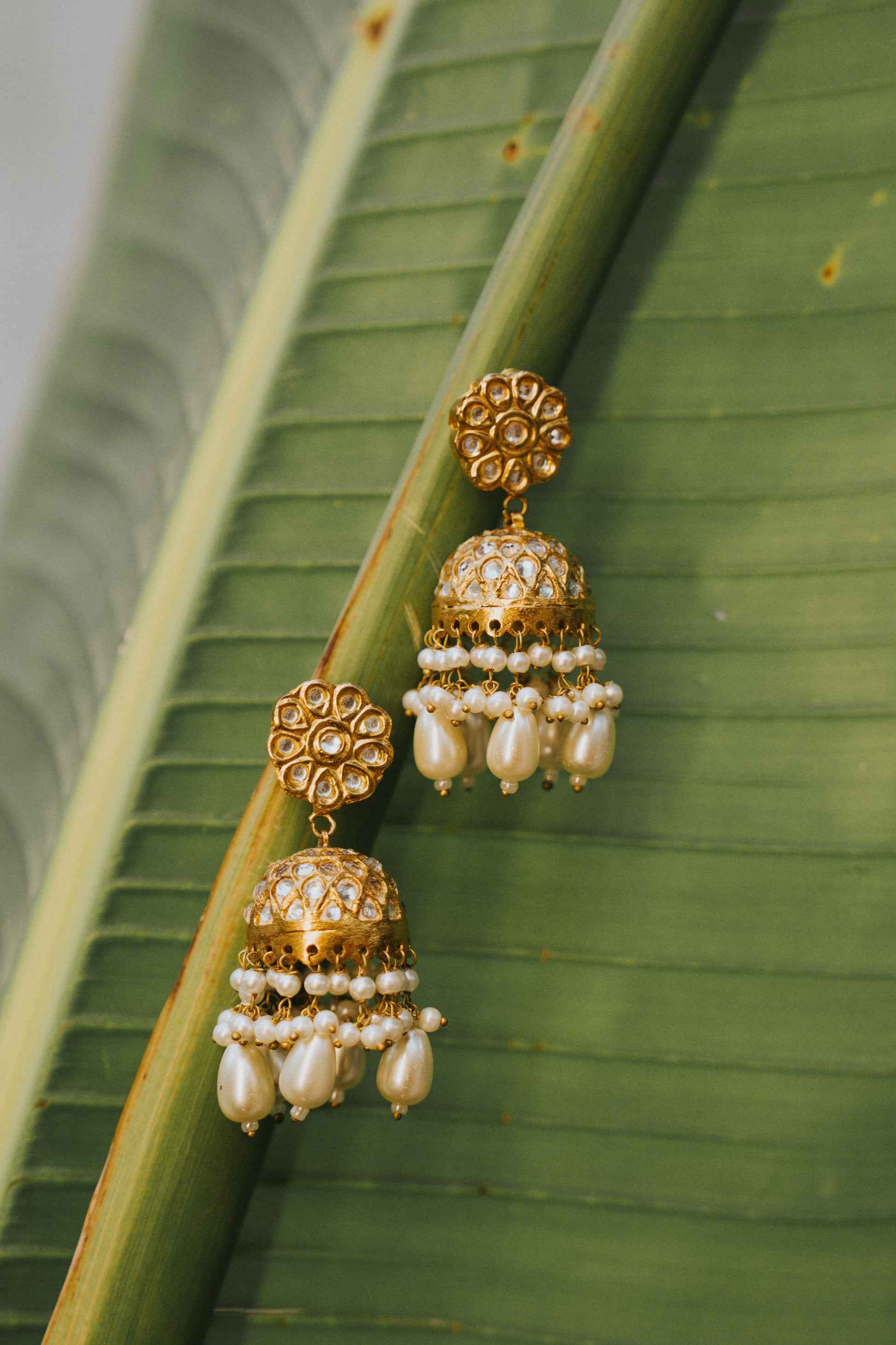 Handcrafted gold-toned jhumkas with Kundan work and pearl drop. The base is hand-carved and polished, with pearl drops individually wired and attached.