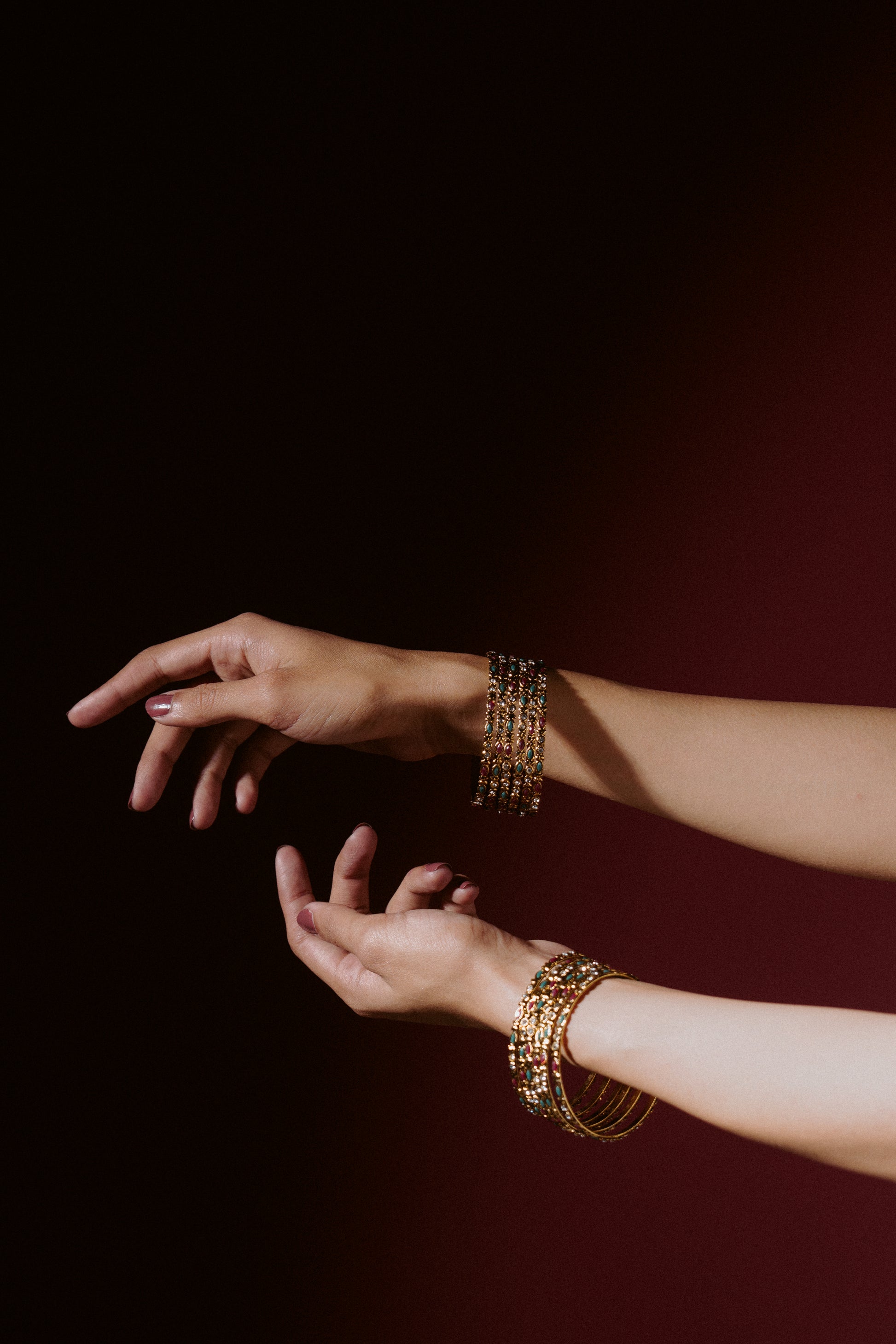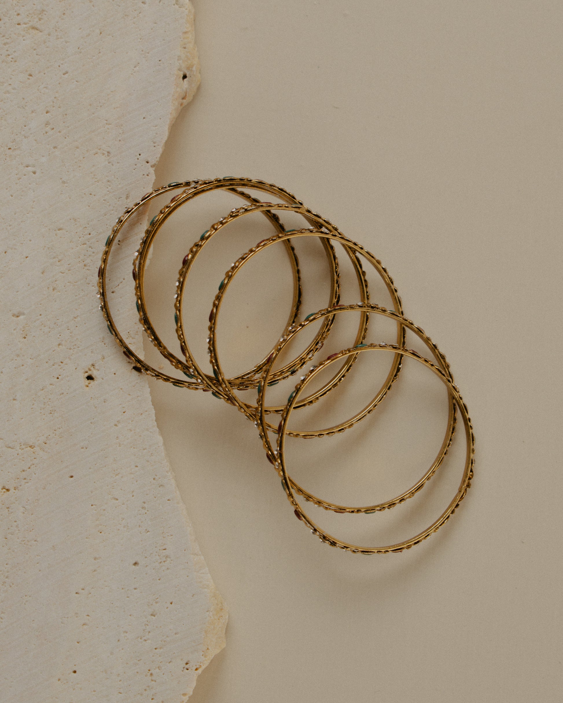 Traditional South Asian kundan-style bangles, featuring intricate gold-toned metalwork inlaid with colored glass stones and polki-style embellishments.