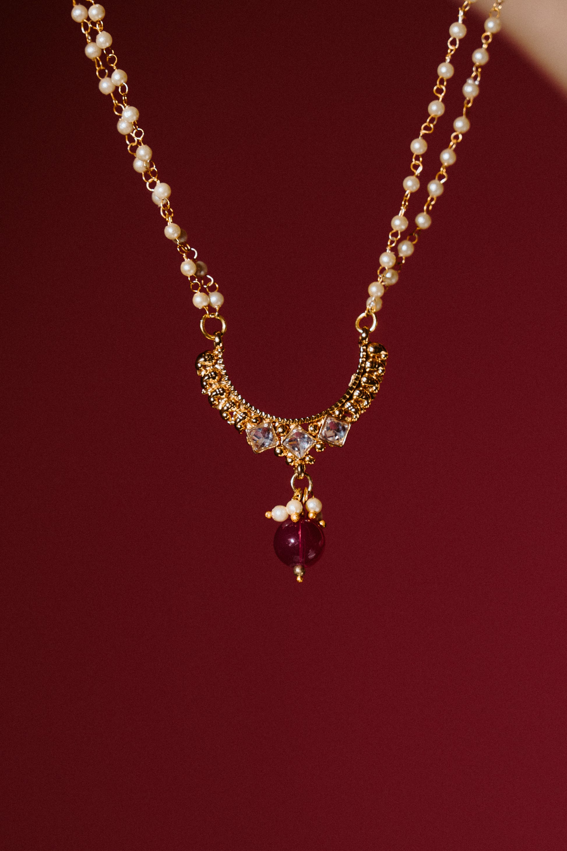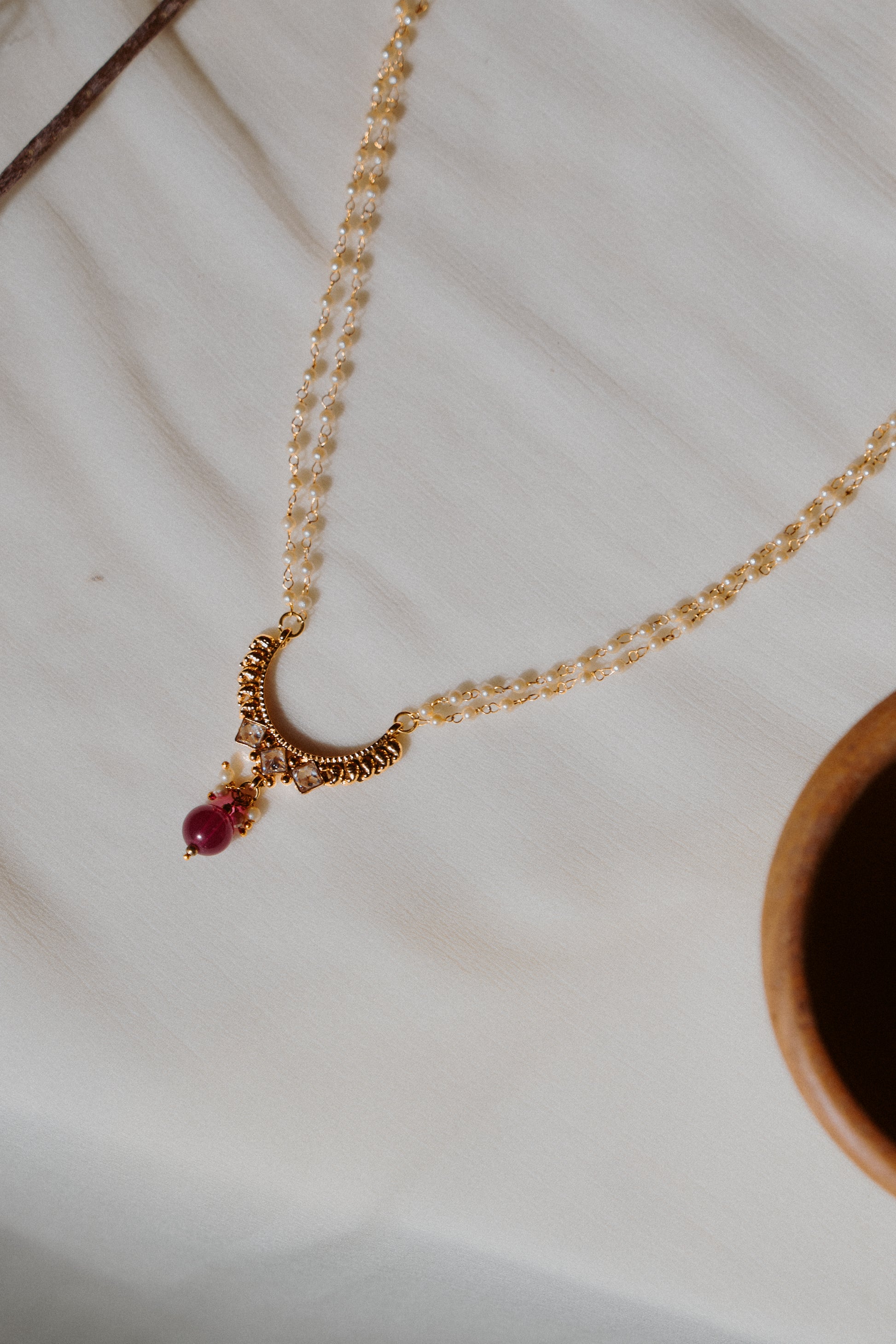 Handcrafted choker with intricate detailing, this gold-toned choker features a crescent motif and a deep ruby drop - a timeless blend of tradition and elegance.